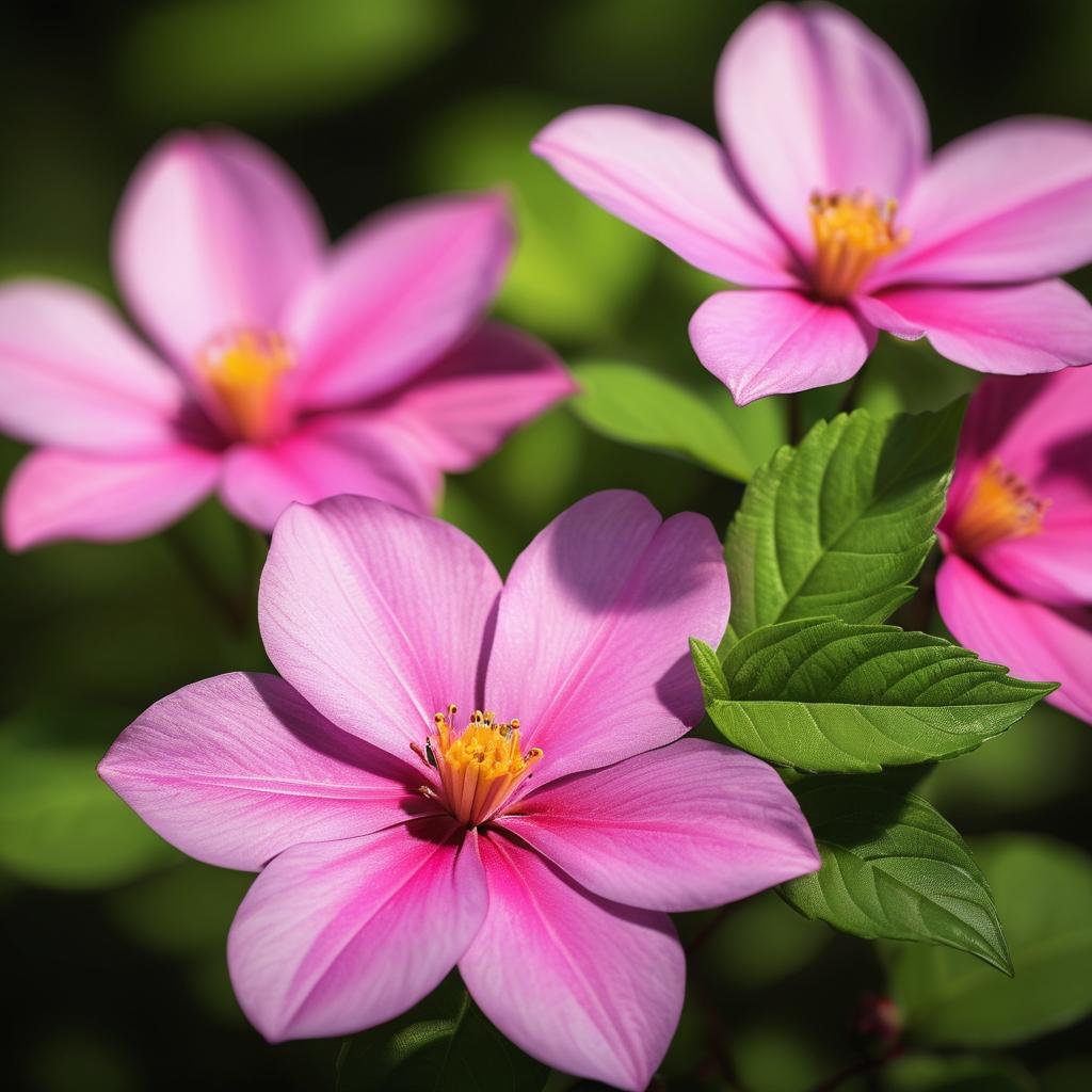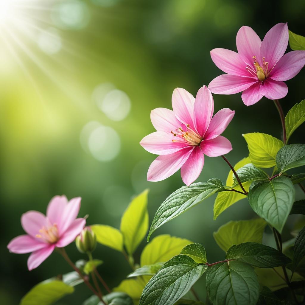 这幅作品以其生动的色彩和自然的构图吸引了观众的目光。通过粉色花朵与绿色背景的鲜明对比,创作者巧妙地捕捉了自然界的纯净与生命力。背景的模糊处理使花朵成为视觉焦点,仿佛在向观众诉说着生命的美丽与短暂。为了使作品更具深度和艺术性,可以在画面中引入更多的自然元素,如阳光的洒落和微风的轻拂,以增添动态感。此外,通过提升色彩的饱和度和对比度,可以使花瓣的细节更加突出,增加作品的视觉冲击力。这些改进将不仅仅是对自然之美的简单呈现,而是对其更为深刻的艺术诠释。通过这样的处理,观众能够更深刻地感受到大自然的魅力与神奇。