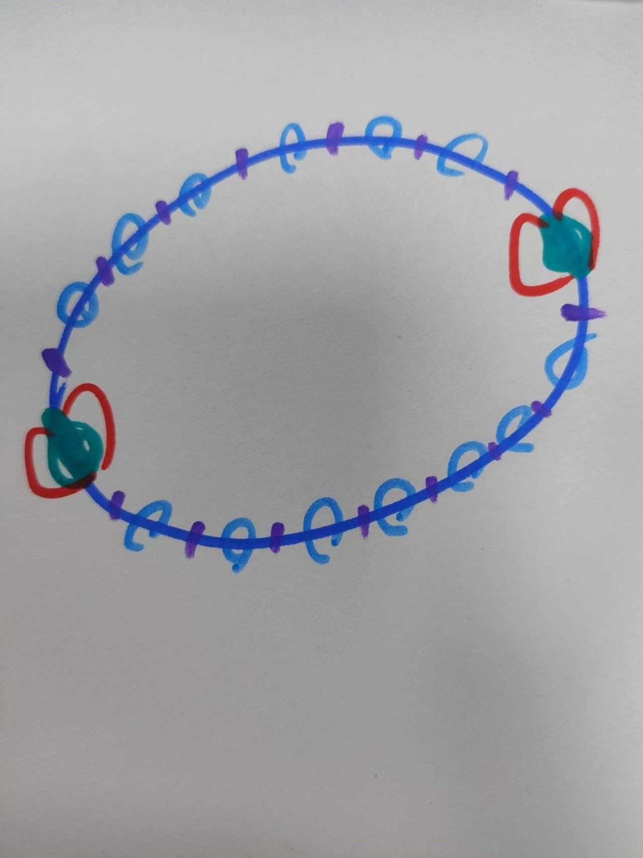 这幅手稿展示了一个极简主义的串珠设计,采用了圆形和几何形态的结合。主要由蓝色和紫色的线条构成圆形结构,红色点缀的部分显得尤为突出,可能代表关键的连接点。串珠的形态较为简单,可能是玻璃或金属珠,色调以冷色系为主。整体构图简洁,呈现出一种流畅的线性美感。