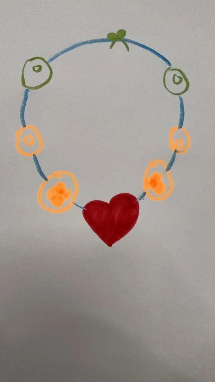 这幅手稿展示了一条由不同颜色串珠组成的项链。串珠包括绿色圆珠、橙色花形珠和一个红色心形珠。整体排列呈对称圆形,体现了现代极简风格中的几何对称美学。蓝色线条连接各个串珠,形成流畅的整体构图。