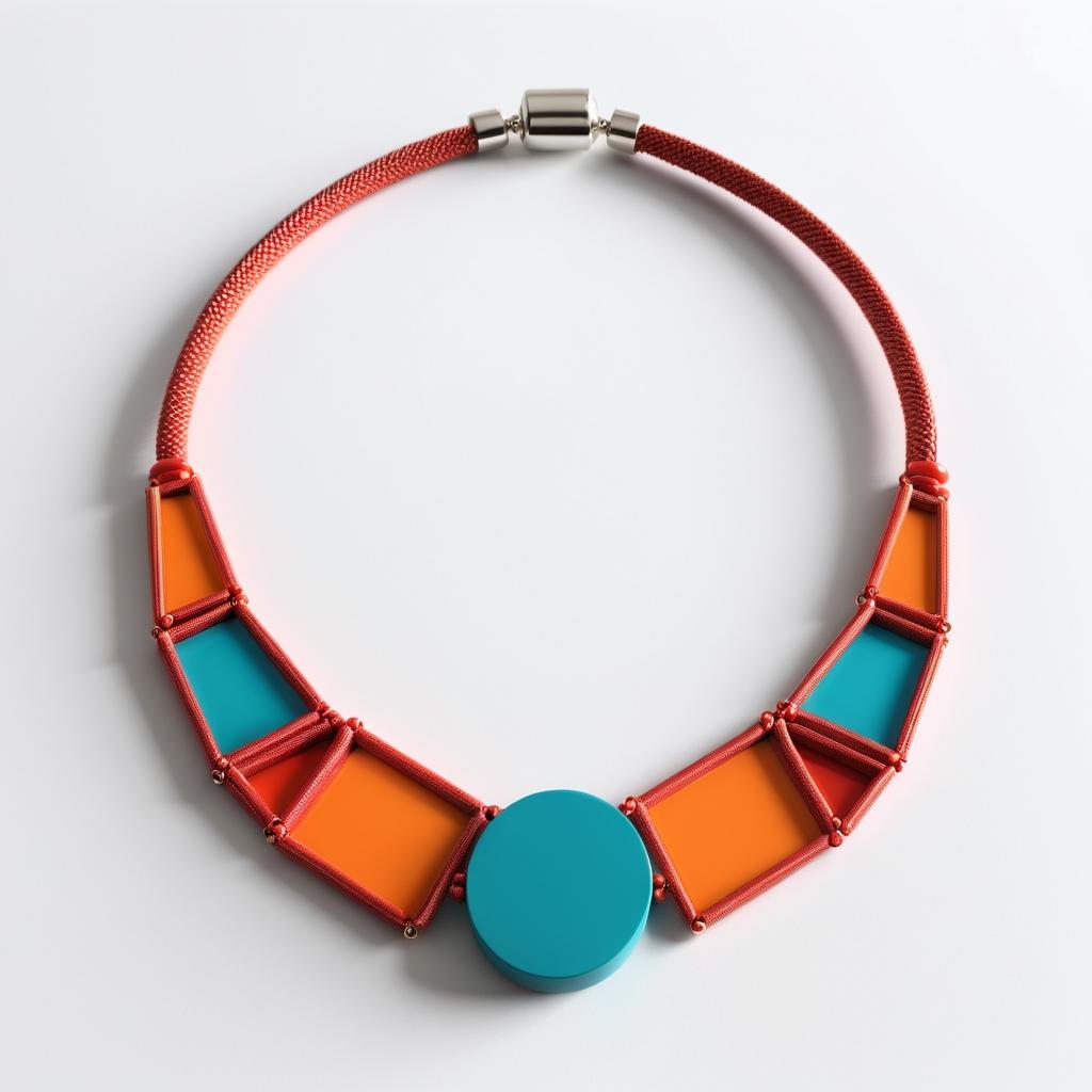 在这幅手稿中,设计师巧妙运用几何形状和色彩的对比,创造出一件极具现代感的串珠项链。中央的红色心形珠成为视觉中心,与周围对称排列的绿色圆珠和橙色花形珠形成鲜明对比。蓝色线条将这些元素连接在一起,增强了整体的流畅性和现代感。通过减少串珠种类和强调中心元素,设计呈现出极简主义的美感。这种设计不仅在视觉上引人注目,同时也具有高度的实用性,适合多种场合佩戴。通过创新材料和工艺的运用,这款项链在美学和功能性上均达到了高标准。