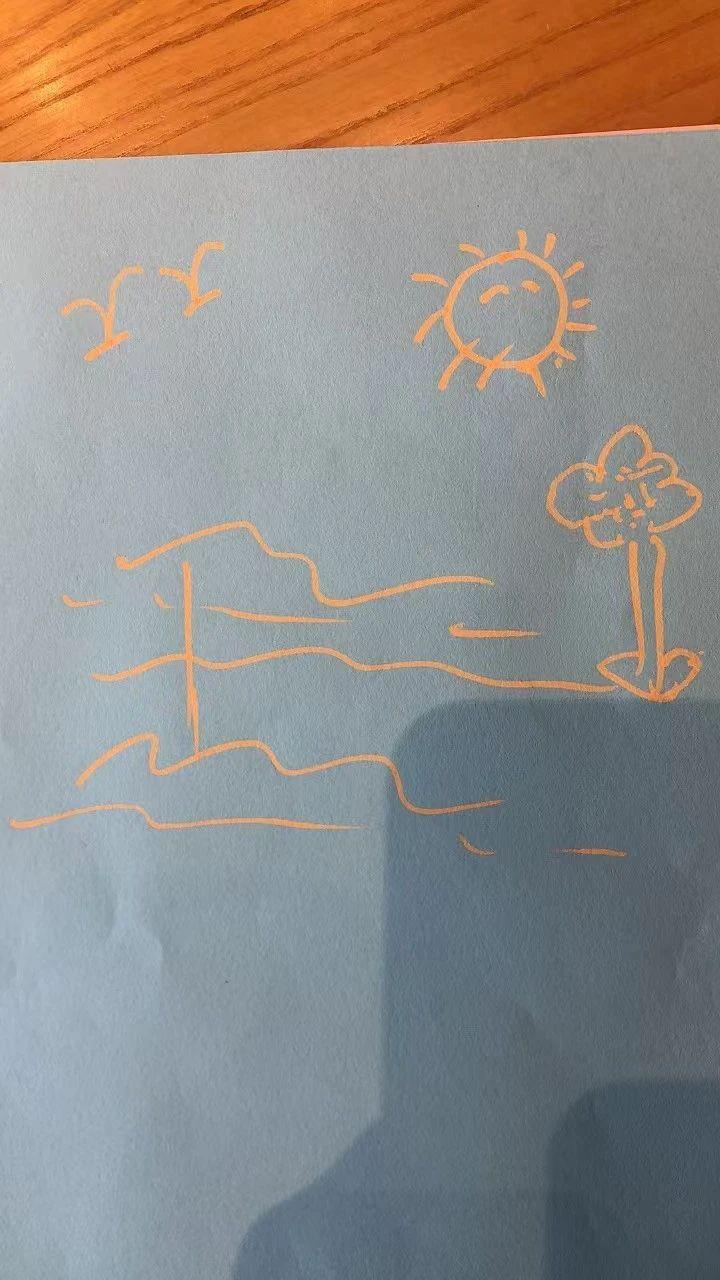 这张手绘图包含了一些简单的线条和形状,如太阳、云朵、飞鸟和花。线条流畅,整体风格较为简约,适合转换为现代简约风格的串珠设计。可以考虑将不同形状的串珠组合成类似图案,使用圆形和不规则形状的珠子来表现太阳和云朵的形态。