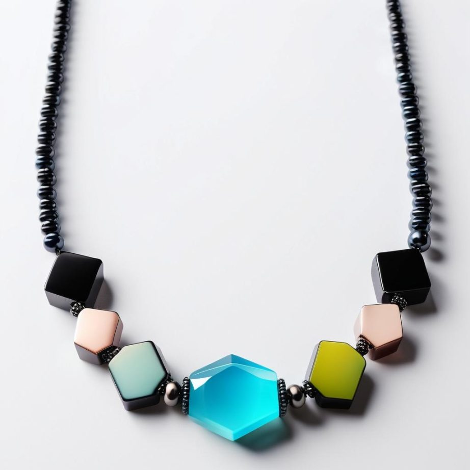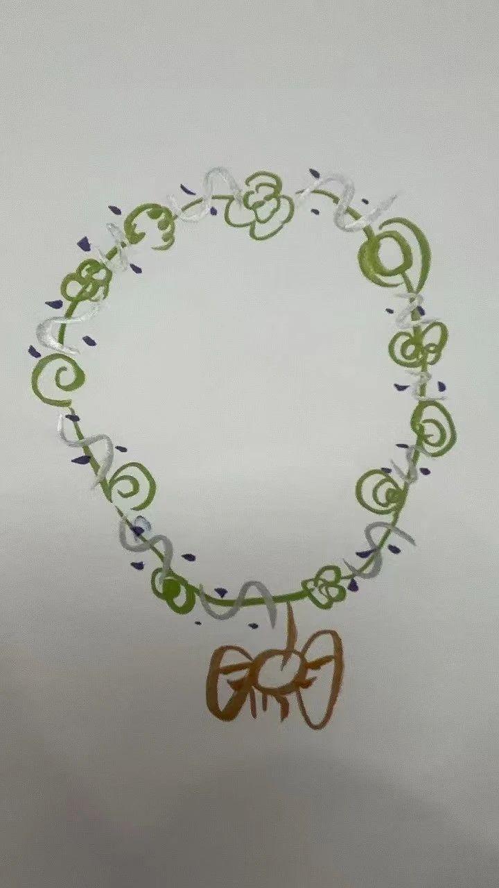 图中展示了一种以绿、白、紫为主的手绘项链设计,串珠呈现不规则形状与排列。绿色线条和涡卷状图案环绕主体,搭配紫色小点缀,带来流畅而自然的视觉效果。整体构图表现了现代简约风格,运用线条的流动性与对比色的点缀,吸引年轻群体的注意。