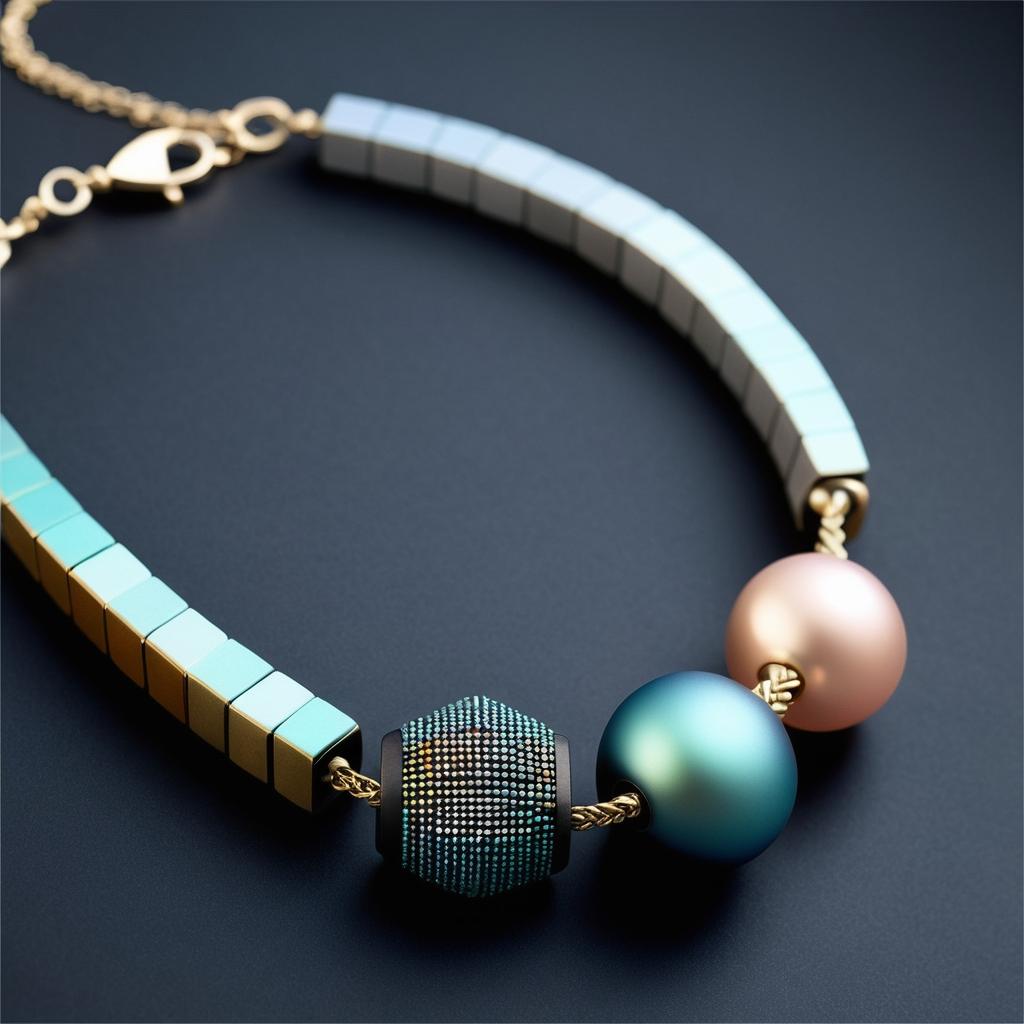 通过减少串珠种类,实现极简主义的美感。结合涡卷形状与不规则排列,创造出既简洁又富有动感的设计。运用留白和线条的延伸感提升作品的空间与现代感。采用柔和的渐变色调与磨砂玻璃材料,赋予设计独特个性。