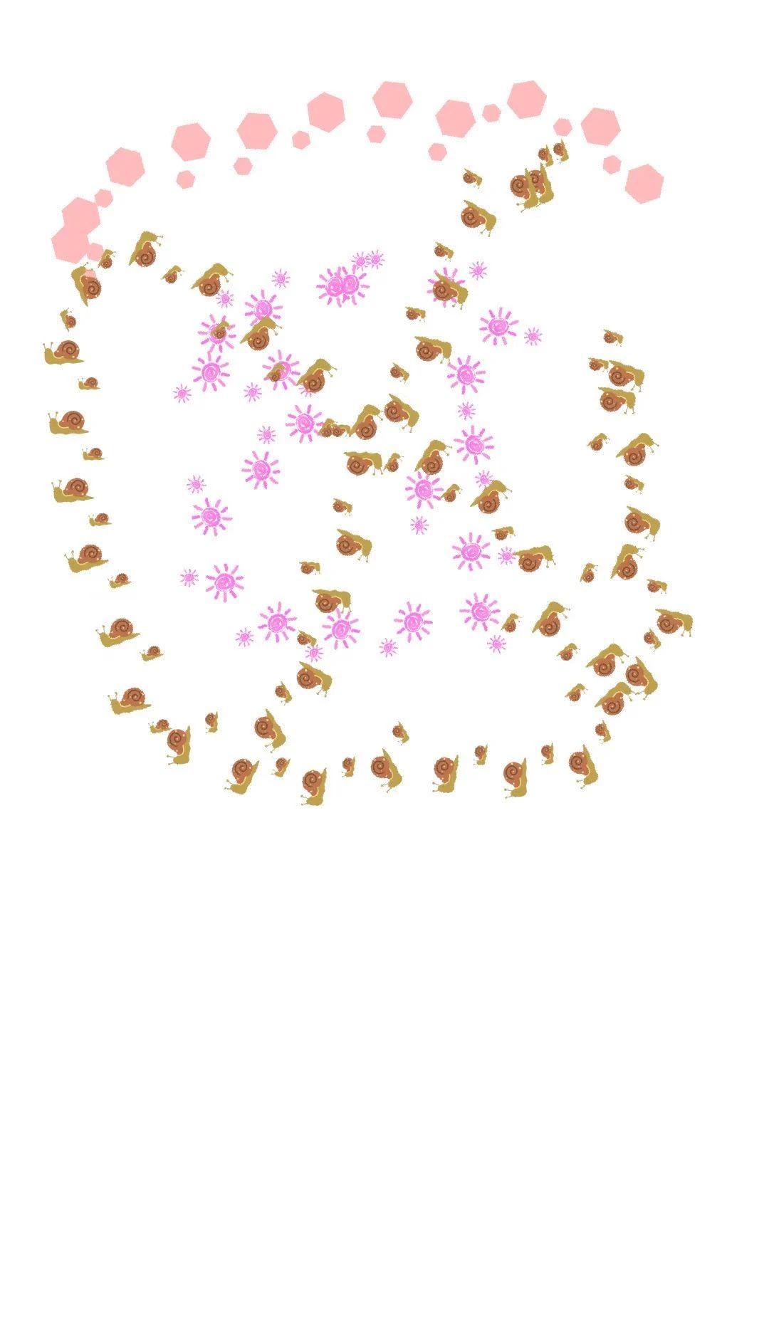 该作品表现出一种轻松和趣味的视觉效果。图中的蜗牛和粉色花形图案形成了趣味性的构图,整体布局呈现出一种旋转的动态感。粉色六边形增加了画面的层次感和动感。色彩上,粉色和棕色的对比让作品显得活泼且生动,传达了一种自然界的生命力和活力。