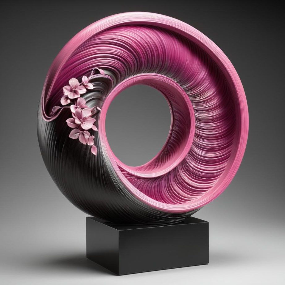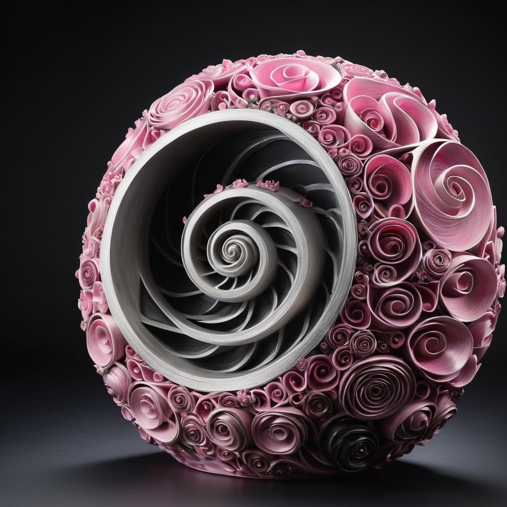 这幅图像通过蜗牛和花朵元素的巧妙组合,呈现出自然界轻松与活泼的一面。这种设计通过旋转的视觉动态和色彩的鲜明对比,唤起观众对自然生命力的共鸣。将这些元素转化为雕塑创作时,可以通过流线型的设计来表现蜗牛的螺旋形态,并运用现代材料如金属和玻璃,增强作品的视觉冲击力。灯光的运用可以进一步强调粉色元素,使雕塑在光与影的交错中展现出不同的艺术层次。这样的设计不仅仅是对自然元素的复制,而是在形式、功能与情感表达上实现了统一,激发观众对自然与艺术的深刻思考。