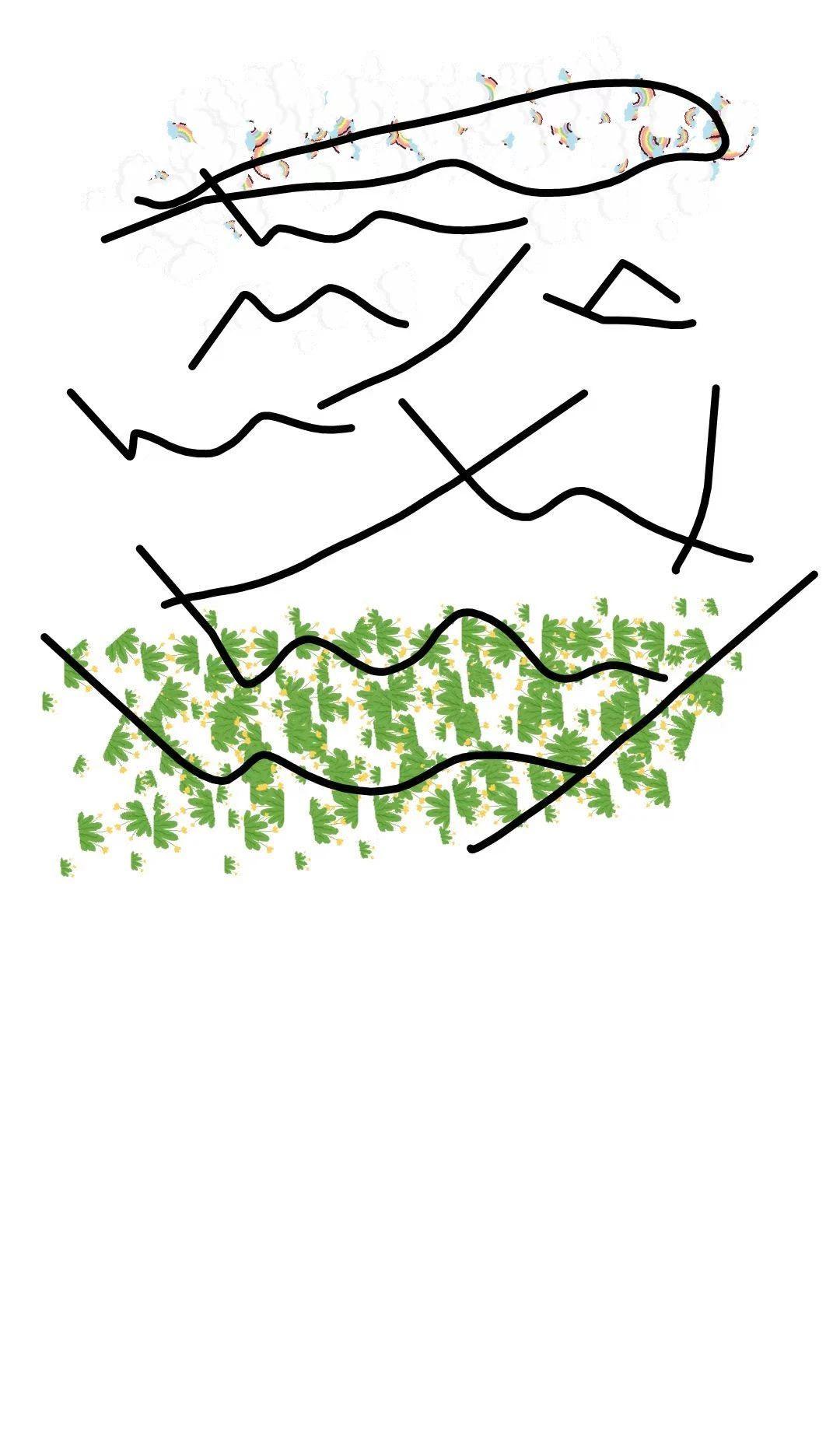 这幅作品展示了多层次的线条交错,结合色彩和自然元素的图案。线条的流畅性与形状的独特性让人联想到山脉与地平线的融合。颜色的运用传达出一种清新自然的氛围,而图案的细节则进一步增强了作品的生动性和流动感。整体构图展现出静谧与动态之间的平衡,情感表达上则给人一种宁静且充满生命力的感觉。