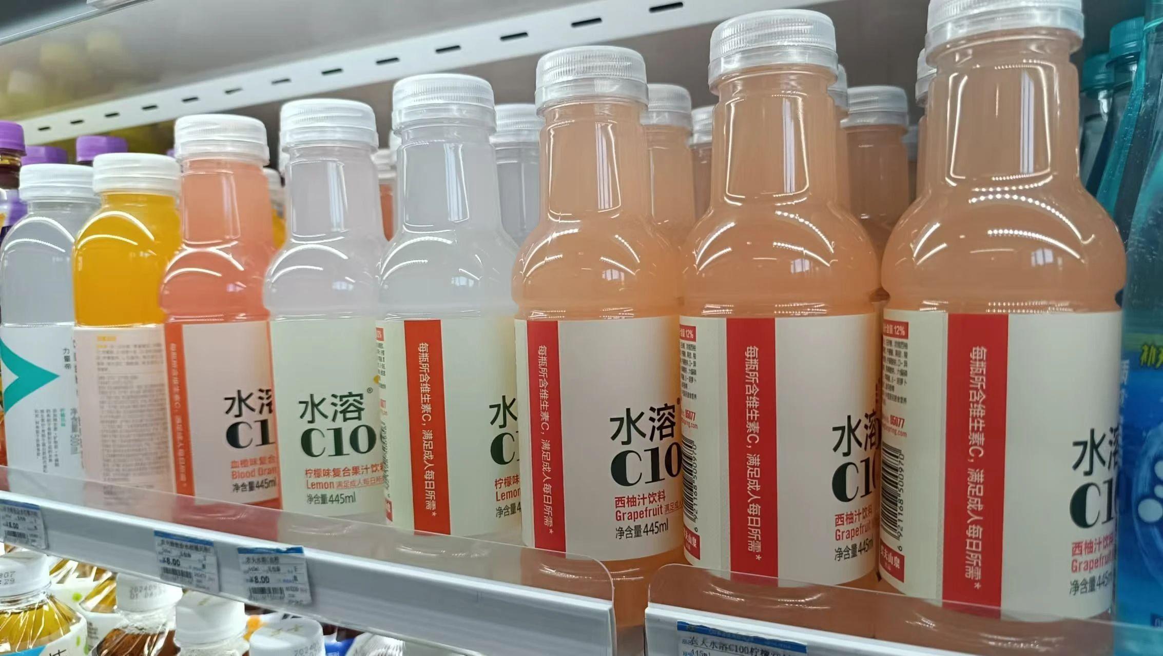 这张照片展示了超市货架上的饮料瓶,排列整齐,色彩丰富。光影效果突出了瓶身的反光,颜色从左到右呈现出渐变的视觉效果,增强了色彩的层次感。背景略微模糊,使得前景的瓶子更加突出。整体氛围轻松且现代,表达了一种消费与日常生活的主题。
