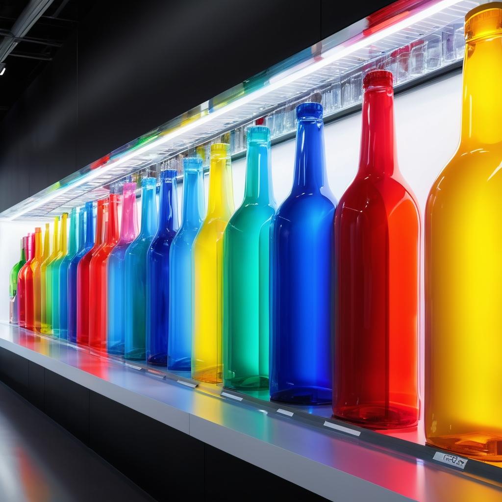 可以将这些瓶子的形状和排列方式转化为雕塑设计,强调其流线型的瓶身和光滑的表面。使用透明或半透明的材质如玻璃或树脂来体现光影的流动感。不同颜色的瓶子可以通过分层上色来表现,形成渐变的色彩效果。雕塑可以设计为互动式装置,以灯光变化来模拟超市中的环境氛围,使其在不同光线下展现出多样的视觉效果。