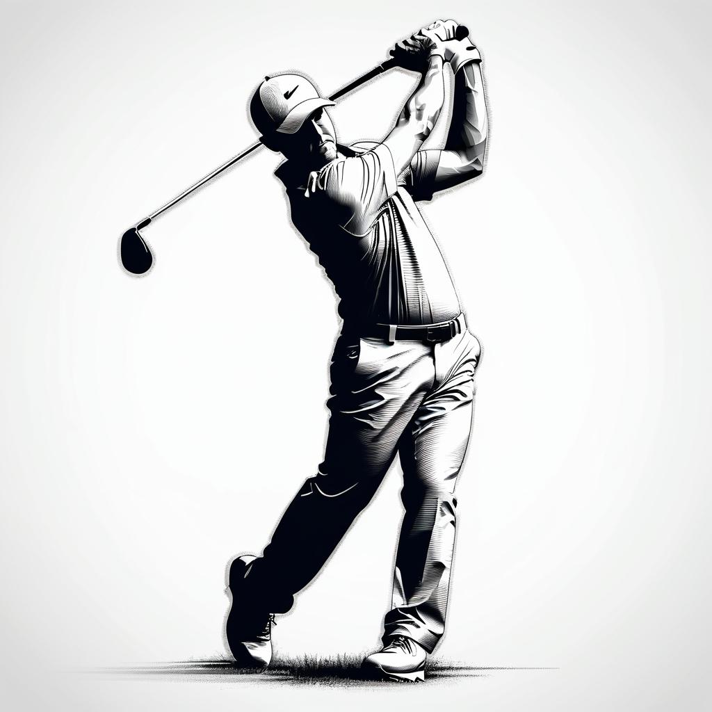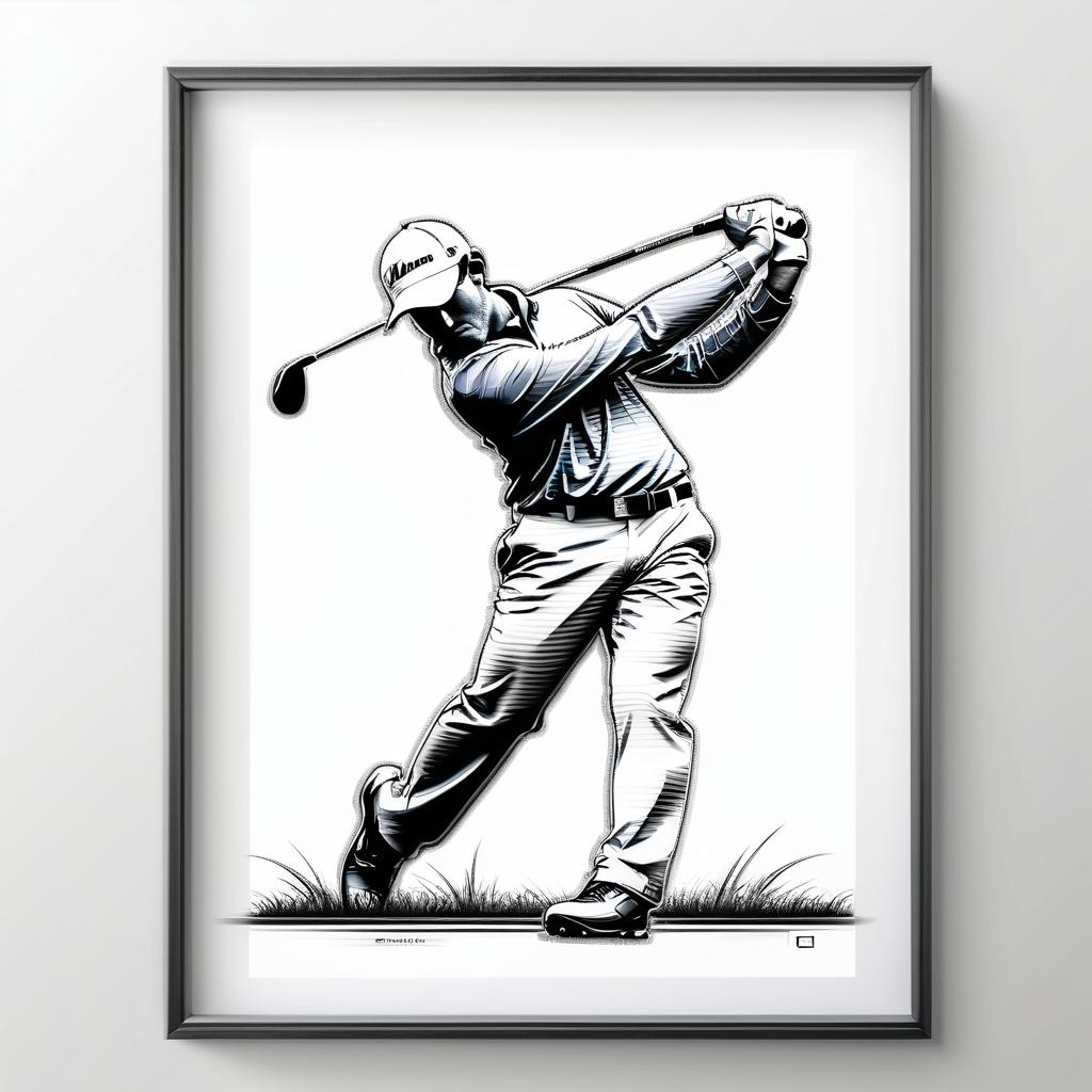 这幅极简主义作品通过简单的线条与形状捕捉了一位高尔夫球手的挥杆瞬间。极简主义的美学强调去除多余细节,专注于核心元素,这在此作品中表现得淋漓尽致。打高尔夫的姿势被精准地通过简化的几何图形传达出来,传递出一种流畅且优雅的动态感。背景使用白色纹理纸张,与黑色线条形成鲜明对比,进一步突显了主体形象。为了提升作品的艺术表现力,可以考虑在背景中加入淡雅的颜色渐变,以增加层次和视觉深度。同时,在人物周围加入高尔夫球和草坪的细节暗示,使整个画面更加生动。通过不同粗细的线条变化,可以在视觉上为人物的姿态增添立体感和动感。这种极简风格不仅简洁明了,还能够引发观众对运动瞬间的联想与共鸣。
