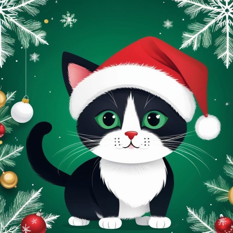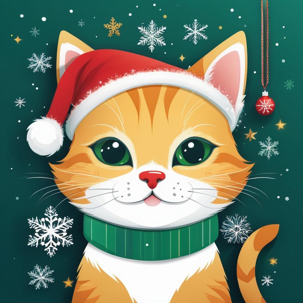 将猫脸作为贺卡的中心元素,搭配圣诞帽,并在背景中加入柔和的雪花和小型灯饰,营造温馨的节日氛围。可以在猫的周围增加一些圣诞礼物的图案,使用红色和绿色作为主要色调,以增强节日感。灯光效果可以运用柔和的金色,提升温暖感。