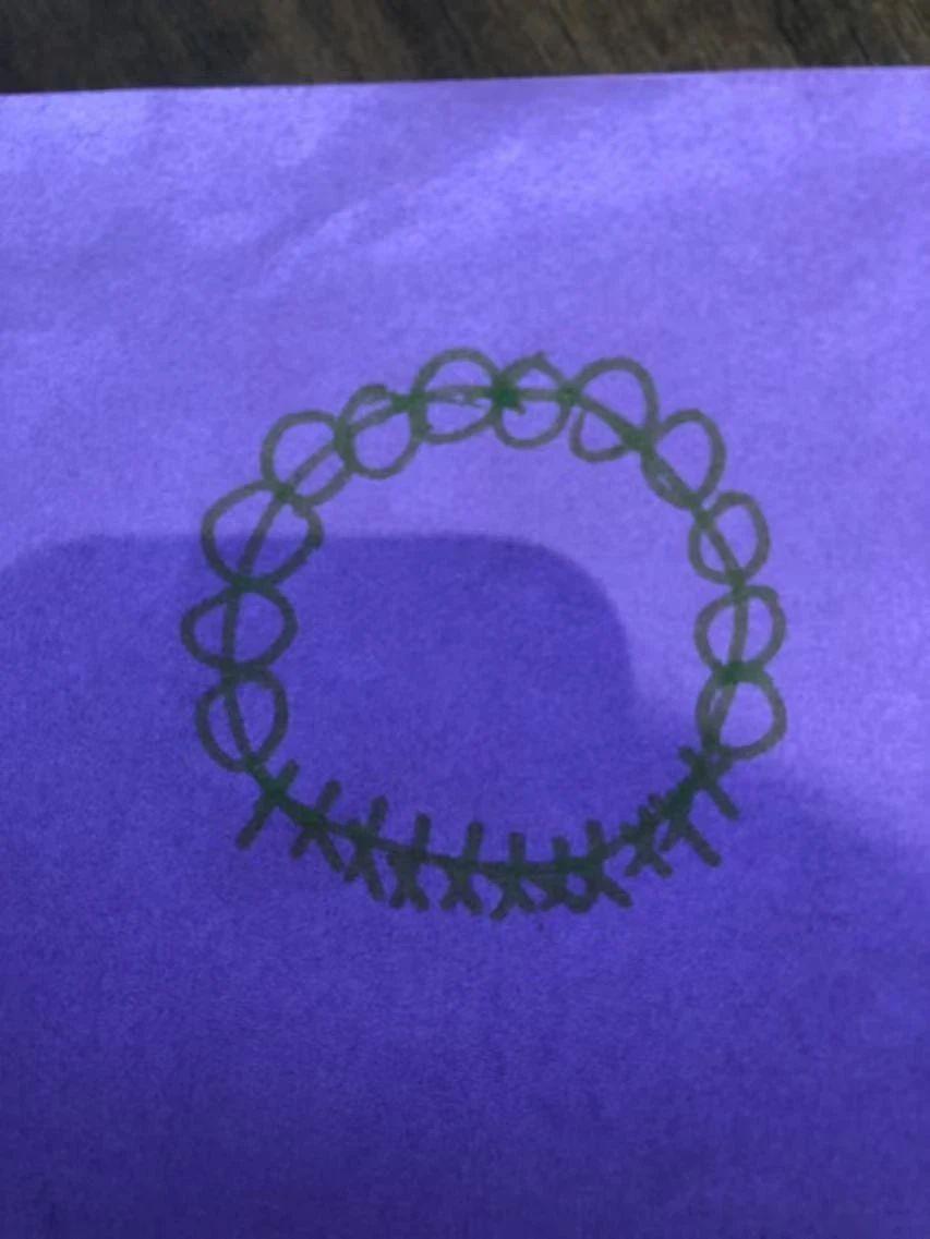 这幅作品展示了一个由简单线条构成的圆圈图案,背景为深紫色。图案中央为空,周围由重复的线条环绕,呈现出一种手绘的质感。虽然没有直接的圣诞元素,但可以通过抽象化的方式将其转化为节日象征,例如装饰品的轮廓。