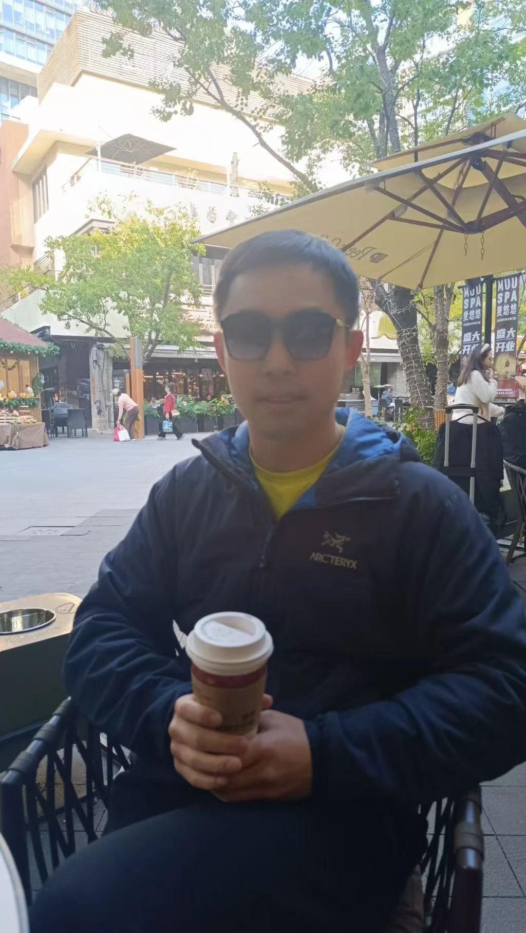 图片中包含一名人物,坐姿轻松,手持咖啡杯,身着休闲夹克和太阳镜,整体氛围轻松惬意。背景为城市街景,包含一些绿色植物和建筑物,阳光透过树叶洒在地面上。缺乏直接的圣诞元素,但可以通过添加装饰来营造节日气氛。