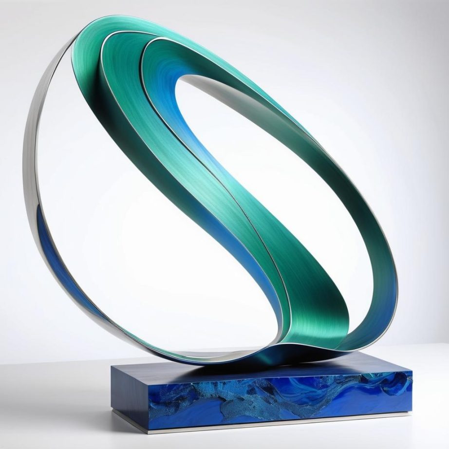 将这幅图像转化为雕塑设计,可以强调线条的流动性与动态感。选择使用光滑的金属材料,如不锈钢或抛光青铜,来呈现绿色线条的流动感,并利用蓝色纹理的背景设计一个光滑的基座,增加反射效果。通过线条的高低起伏与扭转,形成雕塑的核心视觉元素,使其在空间中呈现出多维度的动态美感。