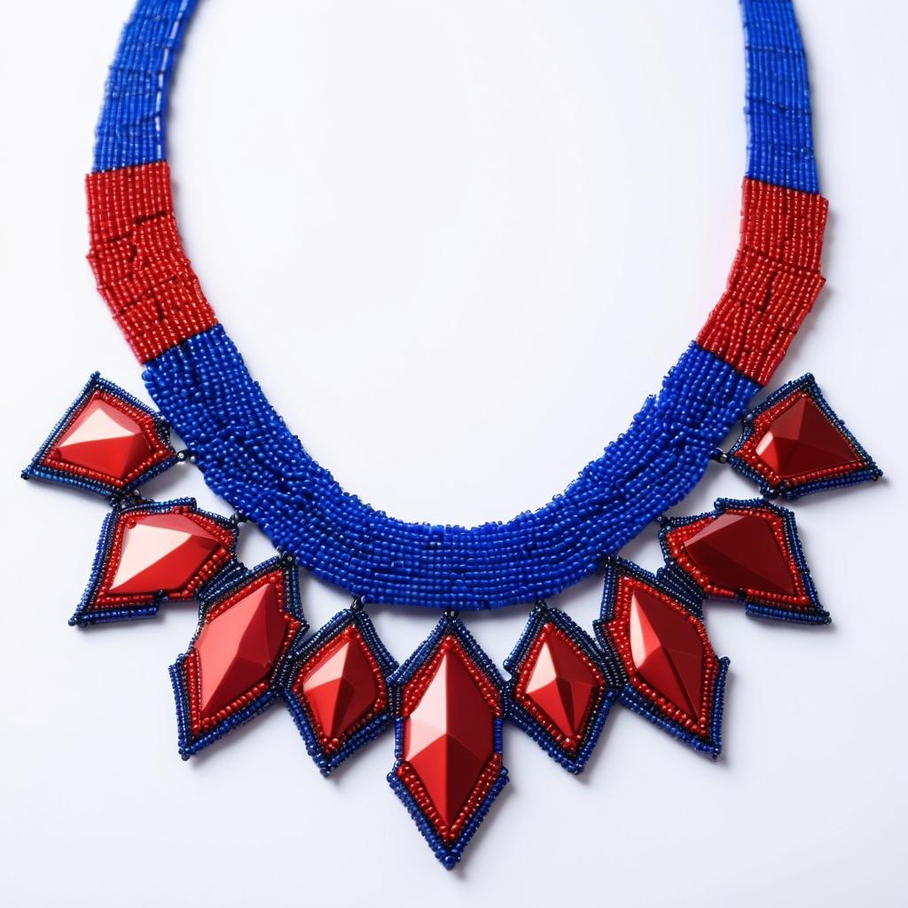 可以将此形状转化为一条具有现代艺术风格的项链。运用红色和蓝色串珠,结合不对称设计,突出个性化和艺术感。考虑使用不规则形状的串珠和金属元素,增加视觉层次。