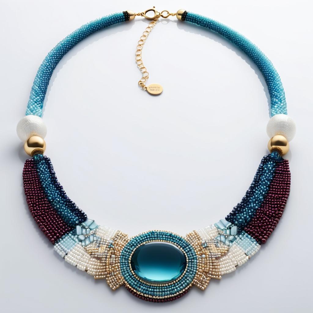利用建筑的几何形态与色调设计一款项链,采用渐变蓝色玻璃珠与金属元素结合。中央可使用不规则形状的吊坠作为焦点,整体呈现现代与对称的美感。