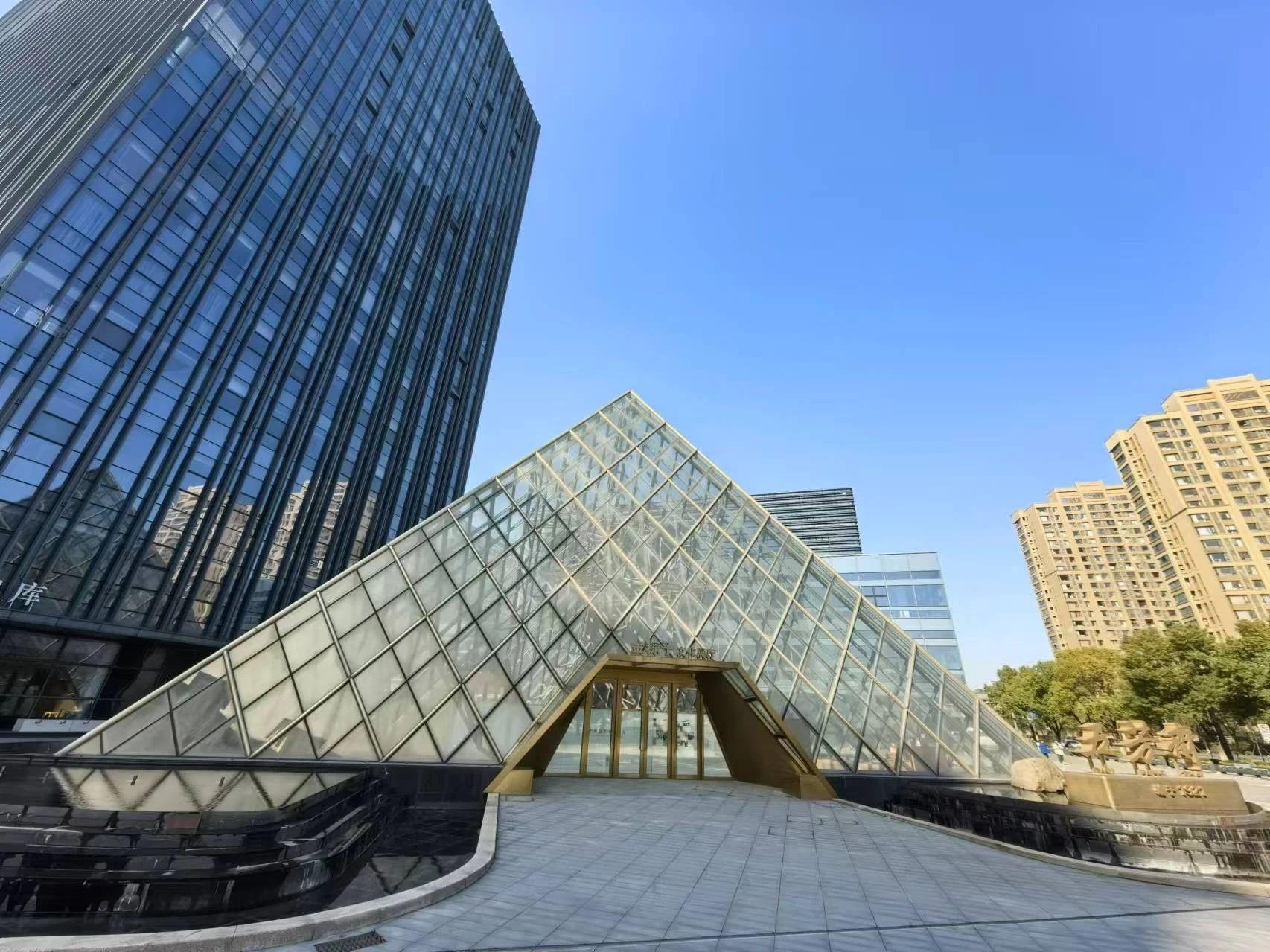 该图片展示了一座现代建筑,具有明显的几何形状和玻璃材质特征。建筑的金字塔形状可以转化为串珠设计中的几何主题。色调以蓝色和金色为主,寓意现代与奢华。