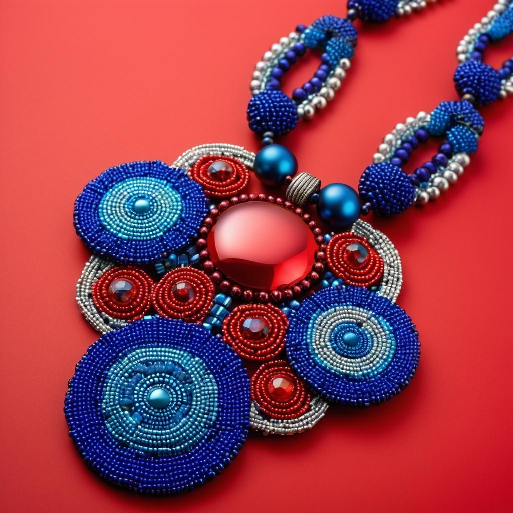 这幅图像展示了一个独特的色彩与形态的结合,通过蓝色、红色、紫色和粉色的搭配,创造出一种鲜明的视觉对比。设计的环形排列具有对称性,同时通过不规则的花瓣状形态增添了动态感。这种设计的灵感可以转化为当代珠宝作品,通过使用不同材质的串珠,如玻璃珠与金属珠,增强设计的奢华感与现代感。此外,中央吊坠的引入以及金属连接件的使用,可以提升整体设计的功能性与艺术性。这种具有艺术感染力的设计方案,不仅符合当前珠宝设计的趋势,也为设计师提供了丰富的创作灵感。