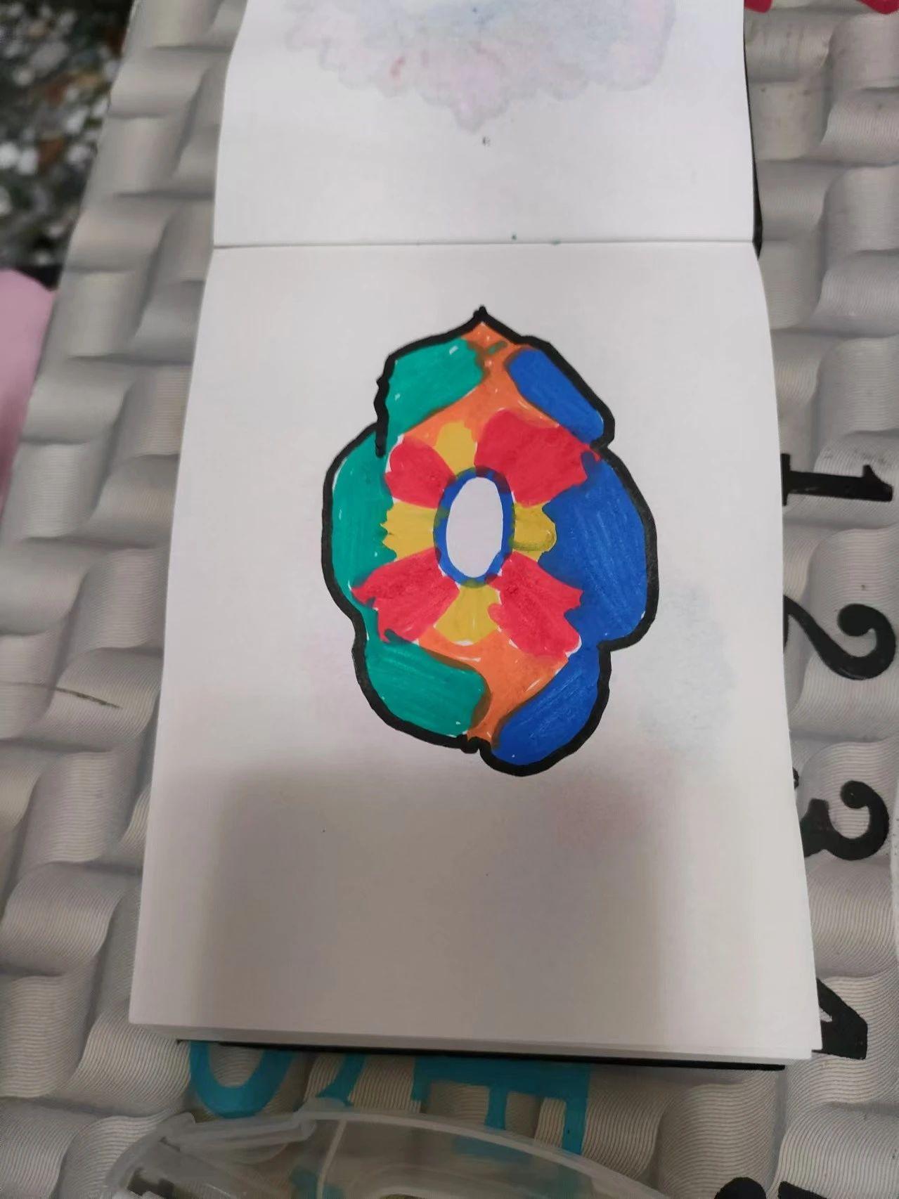 这幅图片展示了一种抽象花卉图案,使用鲜艳的颜色和不规则的形状。主要的颜色包括红色、绿色、蓝色、橙色和黄色,形成了一种对比强烈的组合。中心部分为椭圆形,周围被多边形的花瓣环绕,整体呈现出对称的设计风格。
