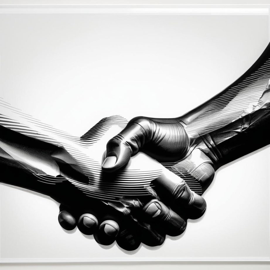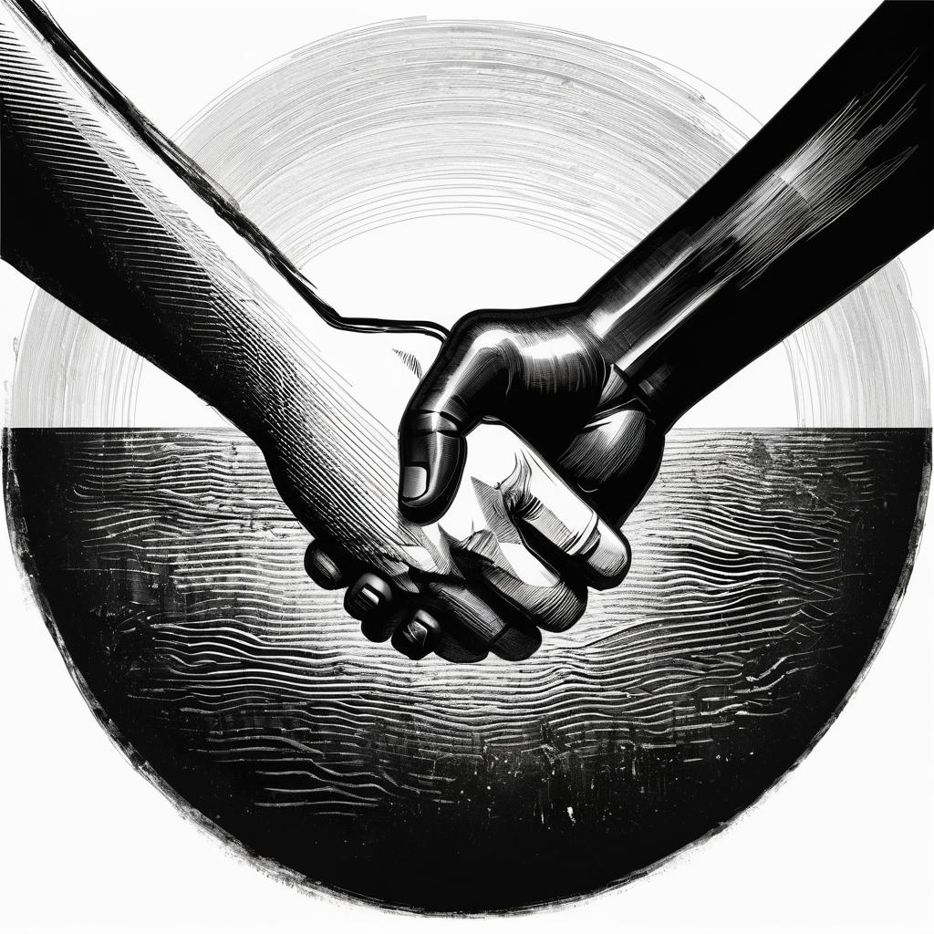 这幅作品通过简单的线条表现出两个抽象人物握手的瞬间,传达出合作与友好的主题。线条的流畅性和形状的简约性,使得作品在形式上极为概念化,但却充满了深刻的情感内涵。通过版画风格的处理,可以进一步强化这种情感表达。高对比度的黑白色调能够突出人物的动作和形态,而线条的刻画和背景的简化则为作品带来了更多的表现力。此作品的创作者意图在于通过最简单的视觉元素,唤起观众对人与人之间交流和合作的深刻思考。结合版画艺术的理论,这种极简的表达方式能够与观众产生强烈的情感共鸣,展示出作品在艺术领域独特的魅力。