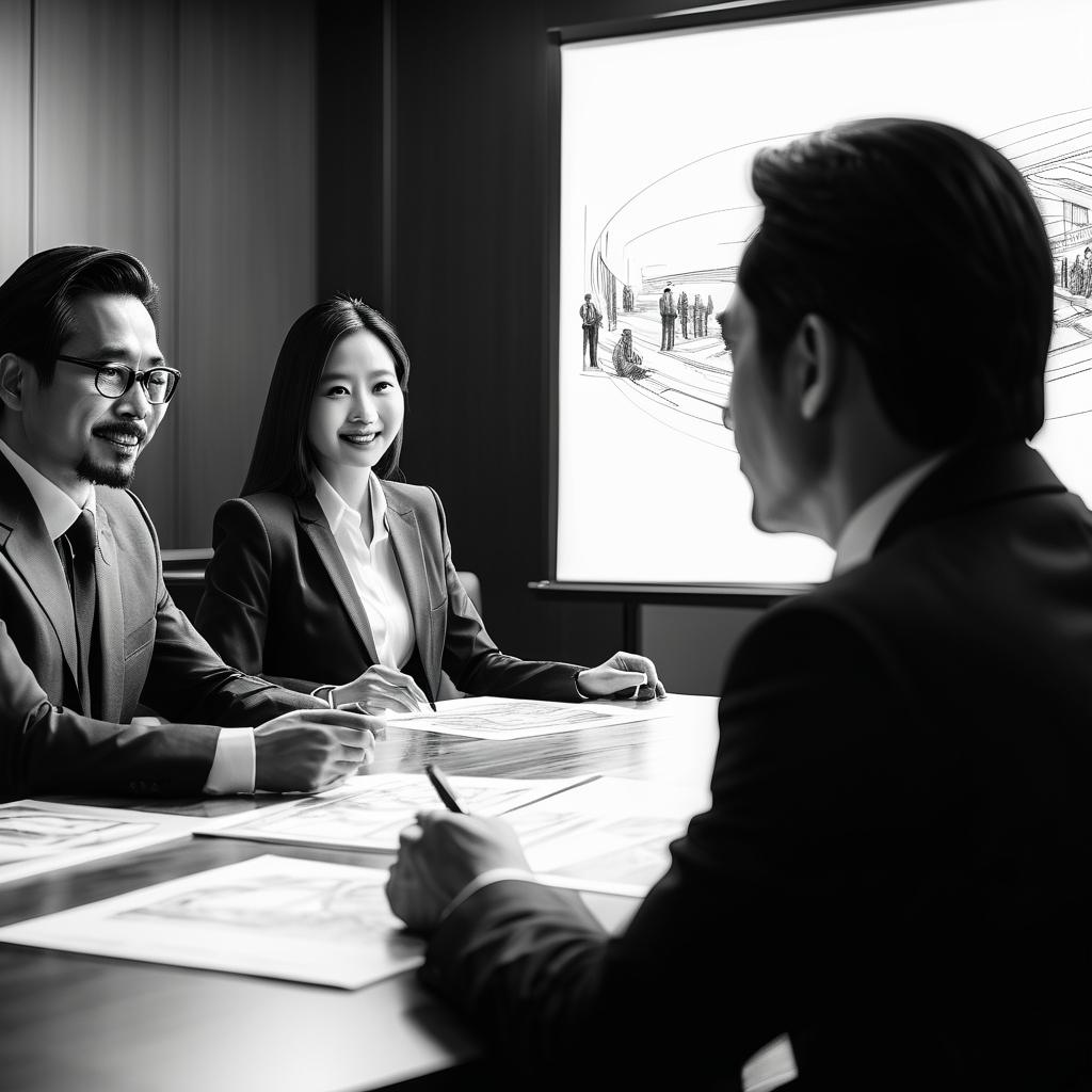 将这张会议照片转换为版画风格时,可以通过增强人物的轮廓线条来突出他们的存在感,同时简化背景的文字与图案,以强调会议主题。使用高对比度的黑白色调,增加版画的戏剧性效果,并保留人物之间的互动和神态,以传达会议的严肃氛围。通过光影的进一步刻画,赋予画面更多的层次感,使其在版画风格中展现出独特的艺术价值。
