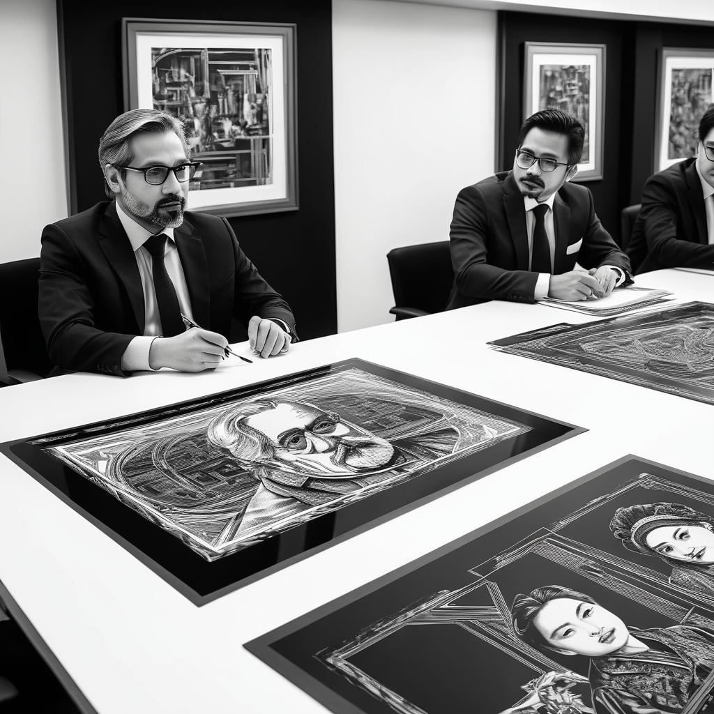 这张会议照片捕捉了一个正式而重要的场合,人物的表情和姿态都传达出一种严肃而集中的氛围。通过版画风格的处理,可以更好地强调这些情感元素。在版画中,人物的轮廓和姿态成为视觉的焦点,背景的简化则让主题更加突出。利用高对比度的黑白色调,增强了光影效果,使观众能感受到会议的权威性和紧迫感。通过这样的艺术处理,作品不仅保留了原照片的纪实性,还赋予了其更深层次的艺术表达与情感共鸣。