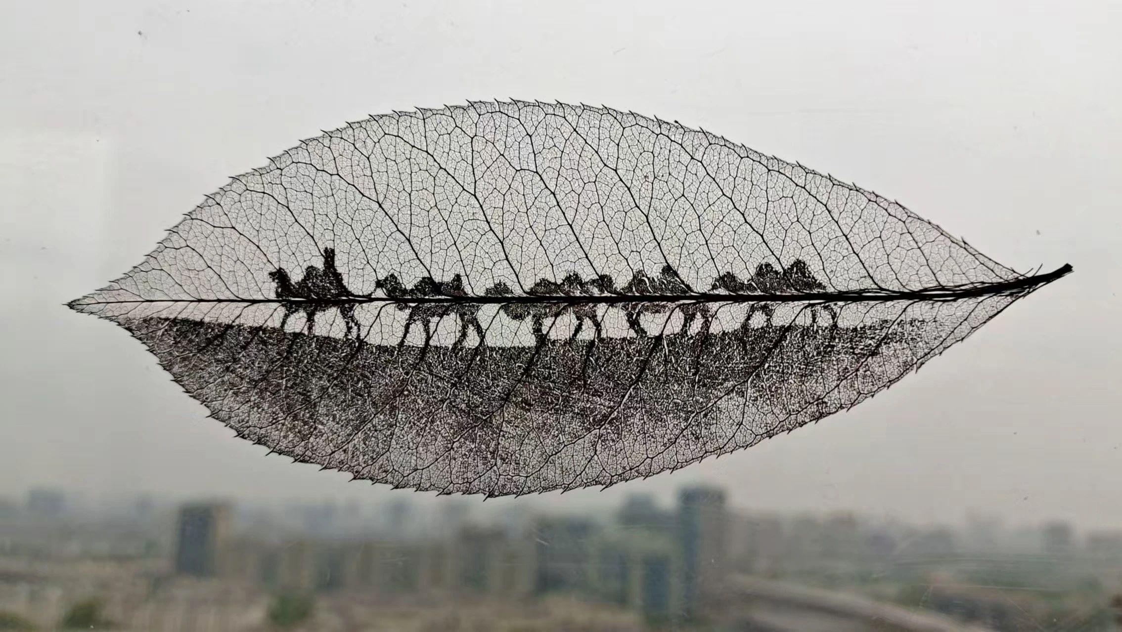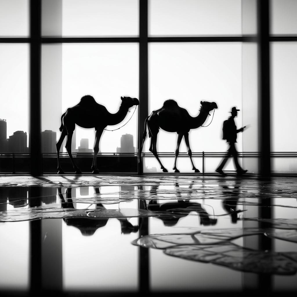 这幅作品以一片树叶为主体,其叶脉细致而清晰,呈现出类似网格的结构。在叶片中间,巧妙地形成了一队骆驼的剪影,营造出一种富有诗意的意境。背景是模糊的城市景观,使得整个画面具有梦幻般的氛围。光影效果的运用非常微妙,叶片的透明感与剪影的黑色形成鲜明对比,增强了视觉冲击力。整体故事性强,似乎在讲述一段旅程或迁徙的故事。