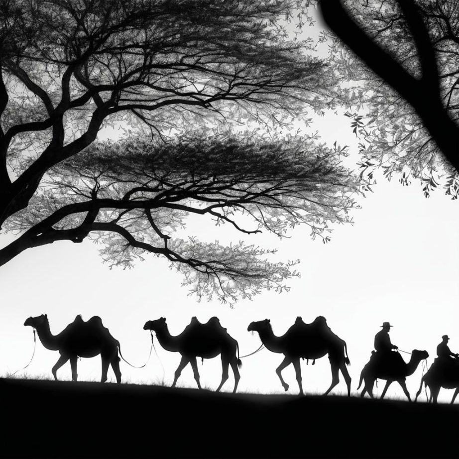 这幅作品通过一片简单的树叶表达了深刻的艺术意图。叶脉如网般的细致纹理与骆驼的剪影形成鲜明对比,仿佛在讲述一段关于旅程的故事。背景模糊的城市景观增添了作品的梦幻氛围,使观者在欣赏时不禁联想到生命的旅途与未知的未来。在版画风格的处理下,叶片的细节将被放大,黑白色调则进一步增强了作品的视觉冲击力和叙事性。通过光影的调整,骆驼的形象变得更加生动,带给观者更强烈的情感共鸣。这种独特的艺术表现方式不仅展现了创作者的意图,也使作品在视觉和情感上获得双重升华。