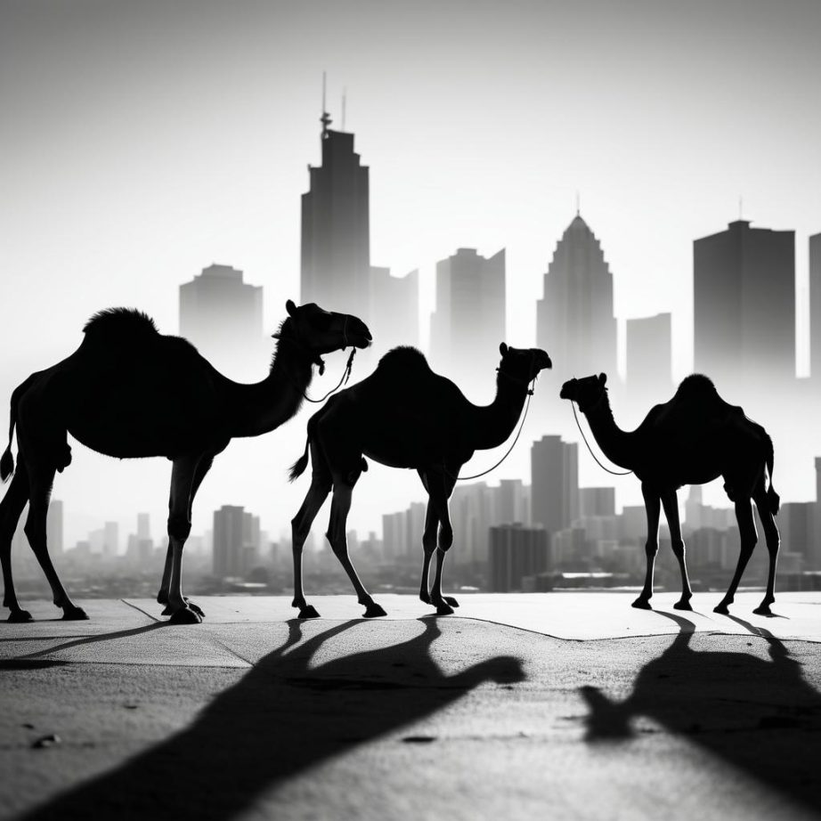 这幅作品以一片树叶为主体,其叶脉细致而清晰,呈现出类似网格的结构。在叶片中间,巧妙地形成了一队骆驼的剪影,营造出一种富有诗意的意境。背景是模糊的城市景观,使得整个画面具有梦幻般的氛围。光影效果的运用非常微妙,叶片的透明感与剪影的黑色形成鲜明对比,增强了视觉冲击力。整体故事性强,似乎在讲述一段旅程或迁徙的故事。