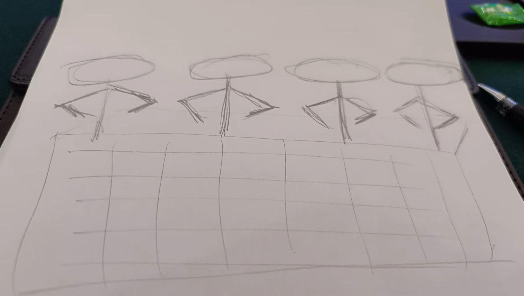 这幅作品以简单的线条勾勒出四个站立的人形,背景是一个有规则分隔的矩形区域,可能代表一个表格或舞台。整个作品以简单的草图表现出一种初步设计的感觉,或许在传达一种集体合作的主题。