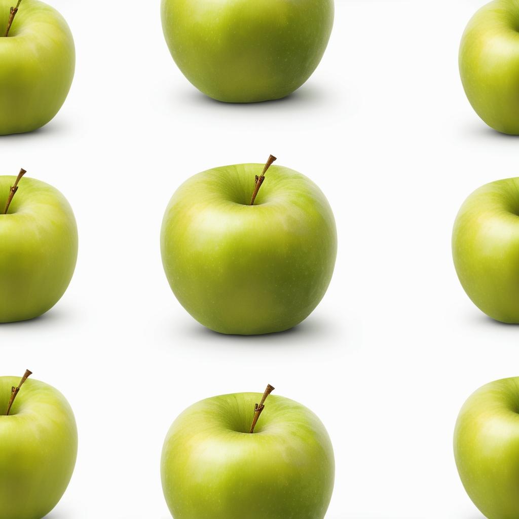 这幅作品展示了一组青黄色的苹果,整齐地摆放在一个白色的盘子中。构图简单而直接,色调主要以青绿色和白色为主。苹果的自然形状和细腻的表面纹理是该作品的视觉焦点,整个画面给人一种清新、自然的感觉。背景的黑色使得盘中的苹果更加突出。