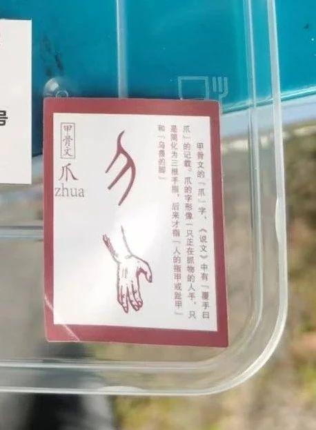 这幅图片展示了甲骨文中的爪字及其演变过程。画面中包含了文字和图案,背景为透明的塑料材质。图案部分是一只手的插画,意在表达爪子的形象。整体色调简单,以深红色和白色为主,给人一种古朴的感觉,可能传达出对古代文字的尊重和探索。