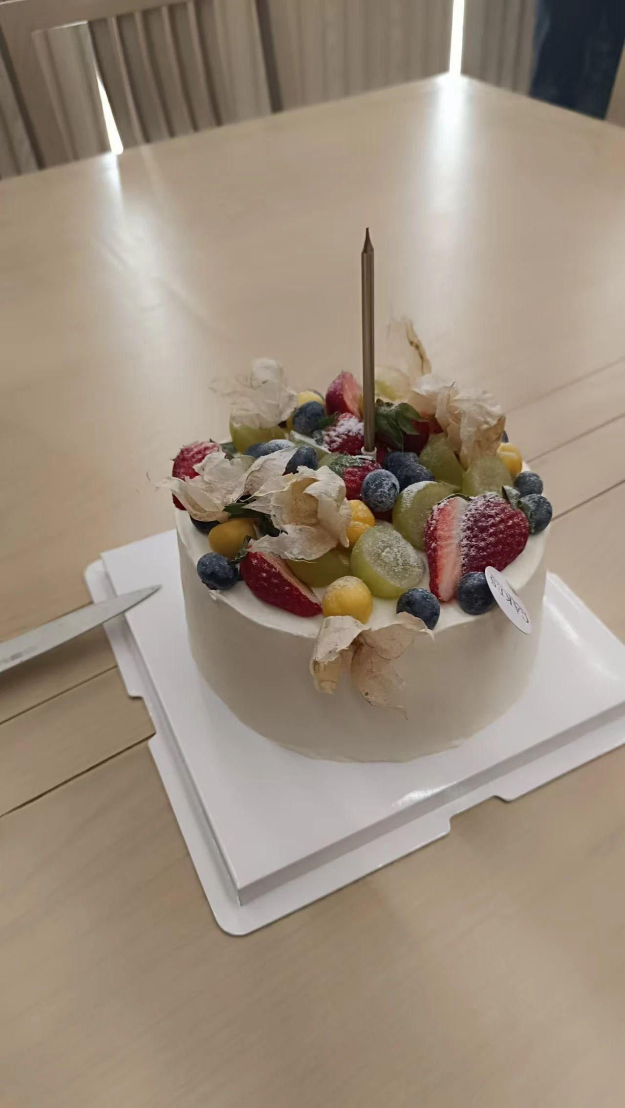 这张照片展示了一份装饰精美的水果蛋糕,背景简洁,桌面光滑且略有反光,营造出一种现代且干净的环境氛围。蛋糕上覆盖着各种水果,如草莓、蓝莓和葡萄,颜色鲜艳,形成鲜明对比,增加了视觉吸引力和活力。光影效果柔和,突出水果的鲜嫩质感和蛋糕的柔滑表面。整体构图简洁,中心集中于蛋糕,具有明确的视觉焦点,传达出庆祝与甜美的主题。