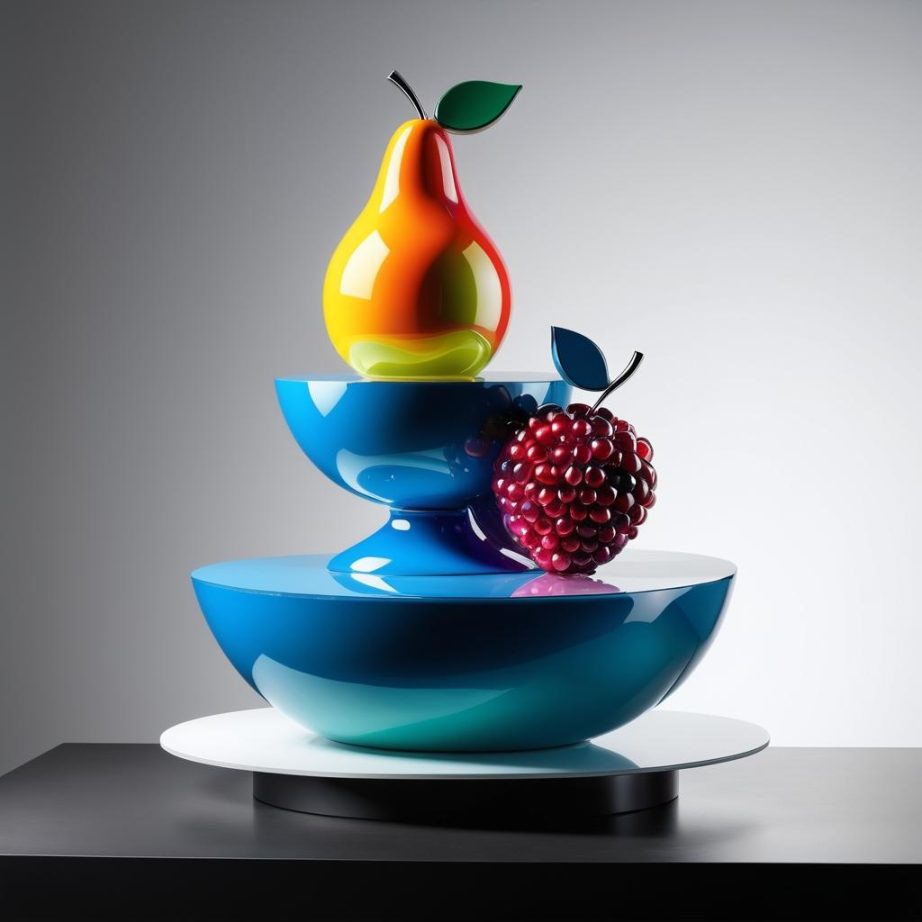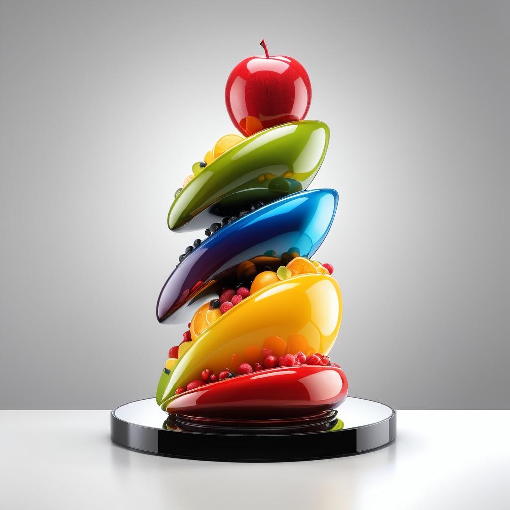 将蛋糕的圆润形状与水果的鲜艳色彩转化为雕塑设计,采用流畅的曲线和光滑的表面材质,如抛光金属或彩色玻璃,以模仿水果的光泽和蛋糕的质感。通过大小不一的圆形元素组合来表现水果的层次感和丰富性,同时在色彩上使用渐变和对比色,增强雕塑的空间表现力和视觉吸引力。雕塑可呈现出庆祝的情感,通过光影效果,营造出一种动态的视觉体验。