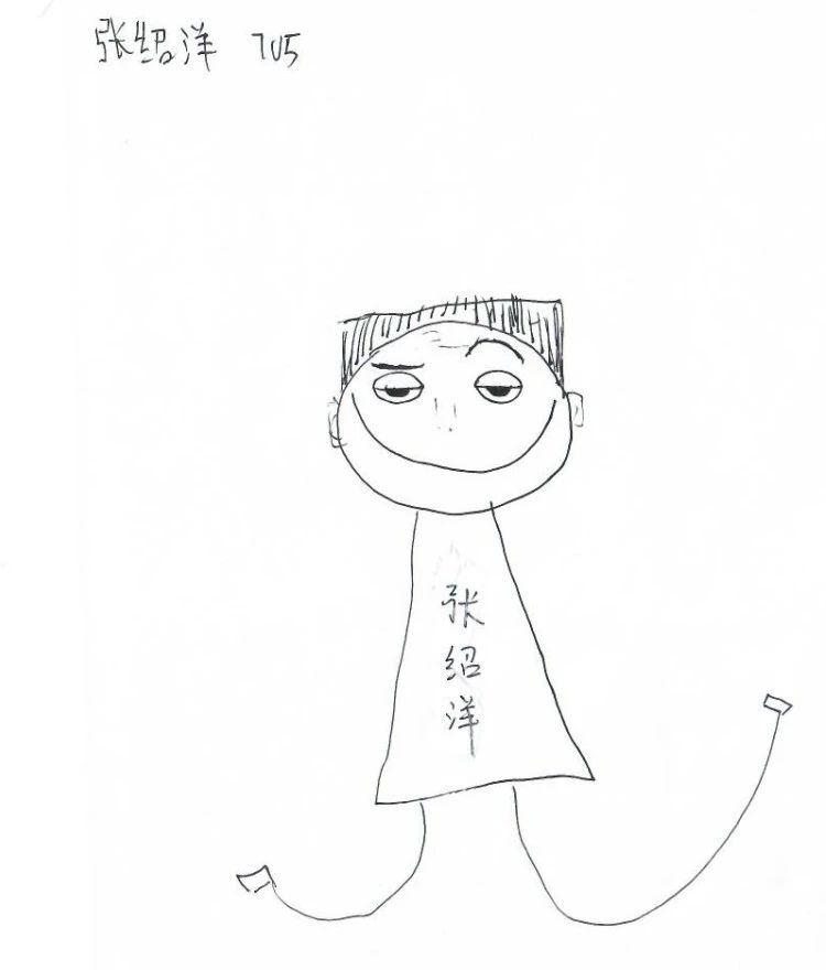 这是一幅简单而富有个性的手稿作品。线条的使用极其简洁,展现了儿童画作的天真与直接。人物面部的表情生动,微微上扬的嘴角和微闭的双眼,传达出一种调皮或自信的情感。人物四肢的线条弯曲,增强了动态感。整体构图轻松而富有趣味,文本元素增加了一层个人化的印记。