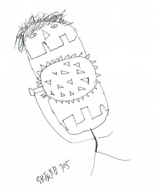 这幅手稿作品以简单的线条和几何形状呈现出一种原始而富有童趣的形象。线条的流畅性中透露出随意性和自发性,形状的构造显得独特且富有创意,尤其是中间的三角形细节,增添了作品的趣味性。整体构图虽不对称,但具有一种奇异的平衡感,展示了艺术家对非传统美学的探索。在情感表达上,作品传达出一种天真无邪和轻松愉悦的情感。