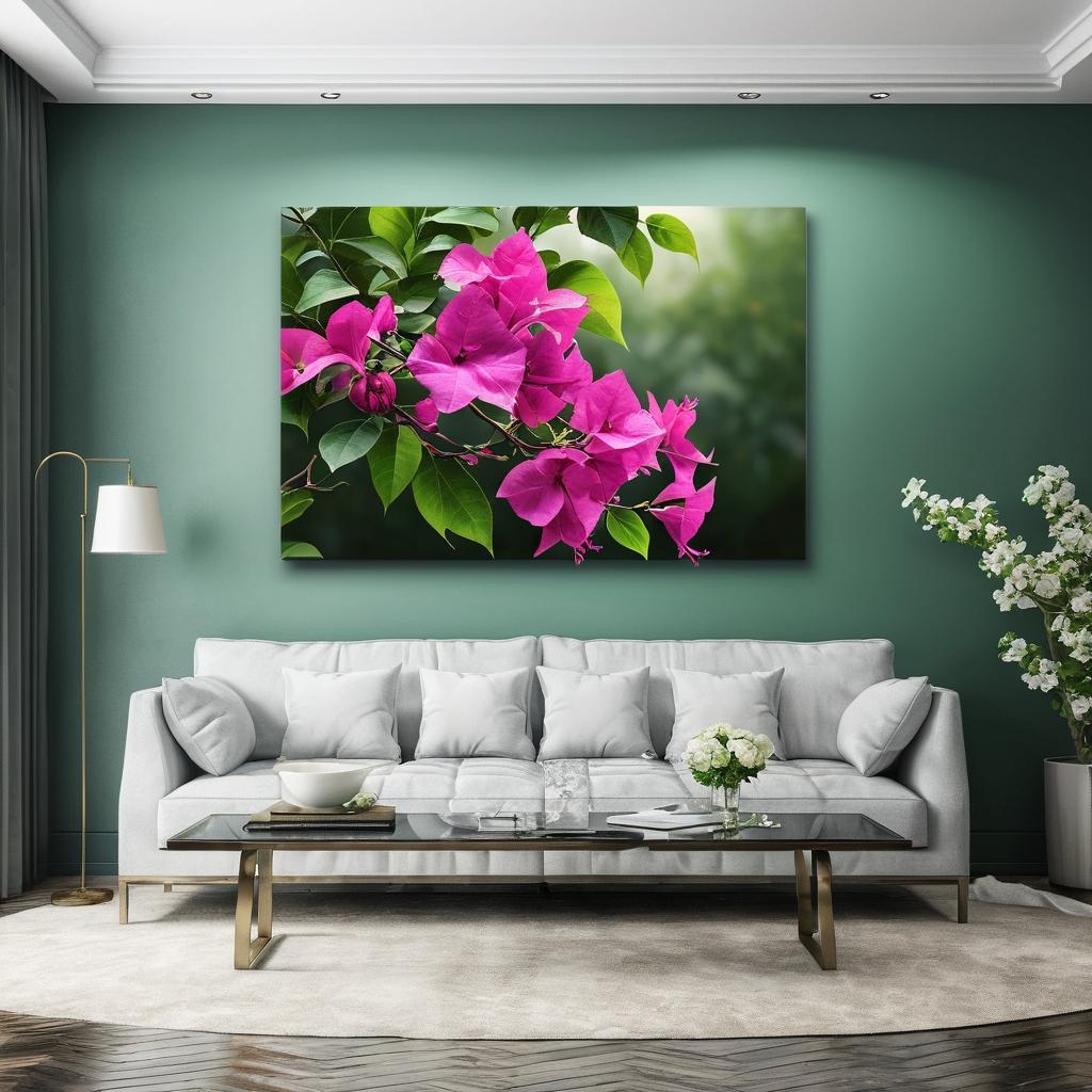 这幅作品呈现了一株盛开的九重葛,鲜艳的粉红色花朵在阳光下显得尤为夺目,与绿色的叶子形成鲜明对比。背景中的玻璃和金属框架带给画面一种现代感,同时也让植物的自然之美更加突出。构图上,植物的枝条呈现出自然的弧形,增添了画面的动感。