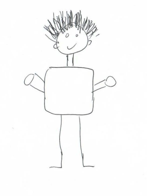 这幅手稿呈现了简约而富有童趣的形象。线条简单而富有表现力,展现了一种天真无邪的情感。方形的身体与圆形的头部和四肢形成了鲜明的对比,增强了视觉上的趣味性。整体构图平衡且富有动感,似乎在表达一种开放和积极的情感。