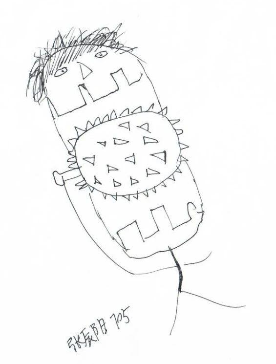 这幅手稿采用了简单的线条和几何形状,传达出一种原始而直接的情感。线条的流畅性和形状的独特构造赋予作品一种童趣与抽象的结合。图形中显现的尖刺形状和面部表情可能暗示出一种防御性或顽皮的情感。整体构图紧凑而有趣,给人一种动态的平衡感。