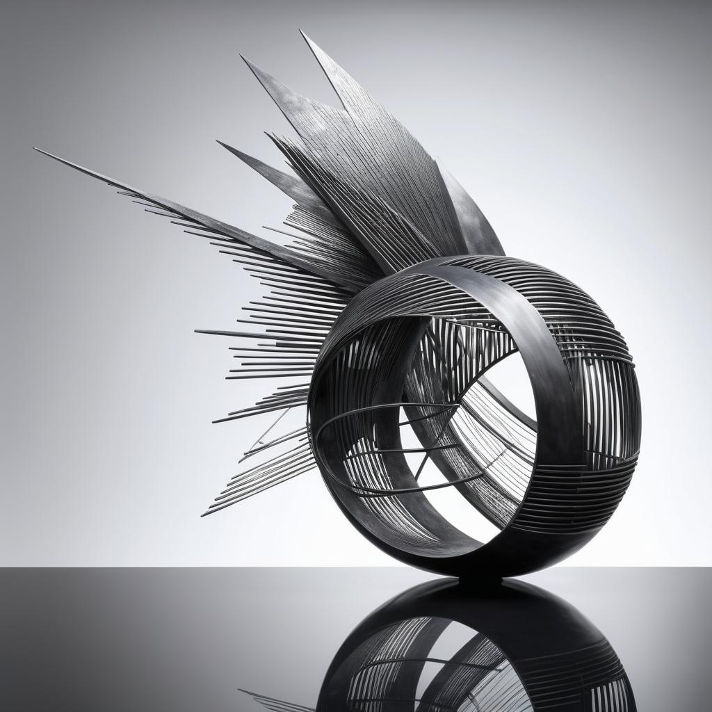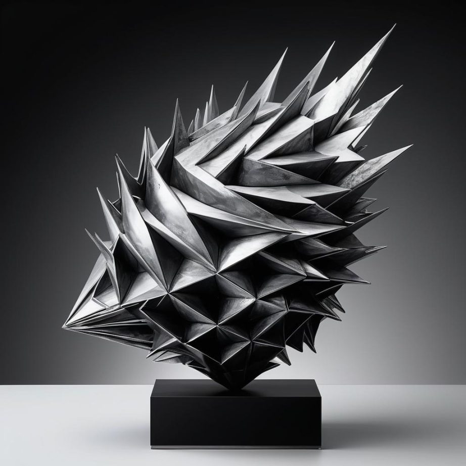 将这幅手稿转换为雕塑设计,可以通过使用金属材料来表现其尖刺的质感,突出形状的动态。雕塑的整体构型可以追求一种动态的平衡感,通过夸张的形态和表面纹理来增强其视觉冲击力。可以使用光滑与粗糙材质的对比来体现图像的情感对比,雕塑应展现出一种童趣,结合现代抽象艺术的表现手法,使其在空间中具有强烈的存在感。