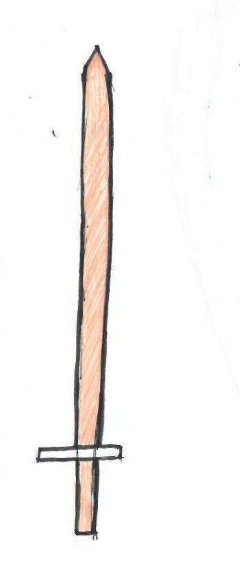 这幅手稿描绘了一把简约的剑,线条流畅且富有表现力。形状的构造极为简单,呈现出笔直且锐利的几何感。颜色采用浅色系,略显温暖,可能意在表达某种平和的情感。整体构图简洁,但剑的直线和交叉护手形成了强烈的视觉对比,强调了力量与平衡的主题。