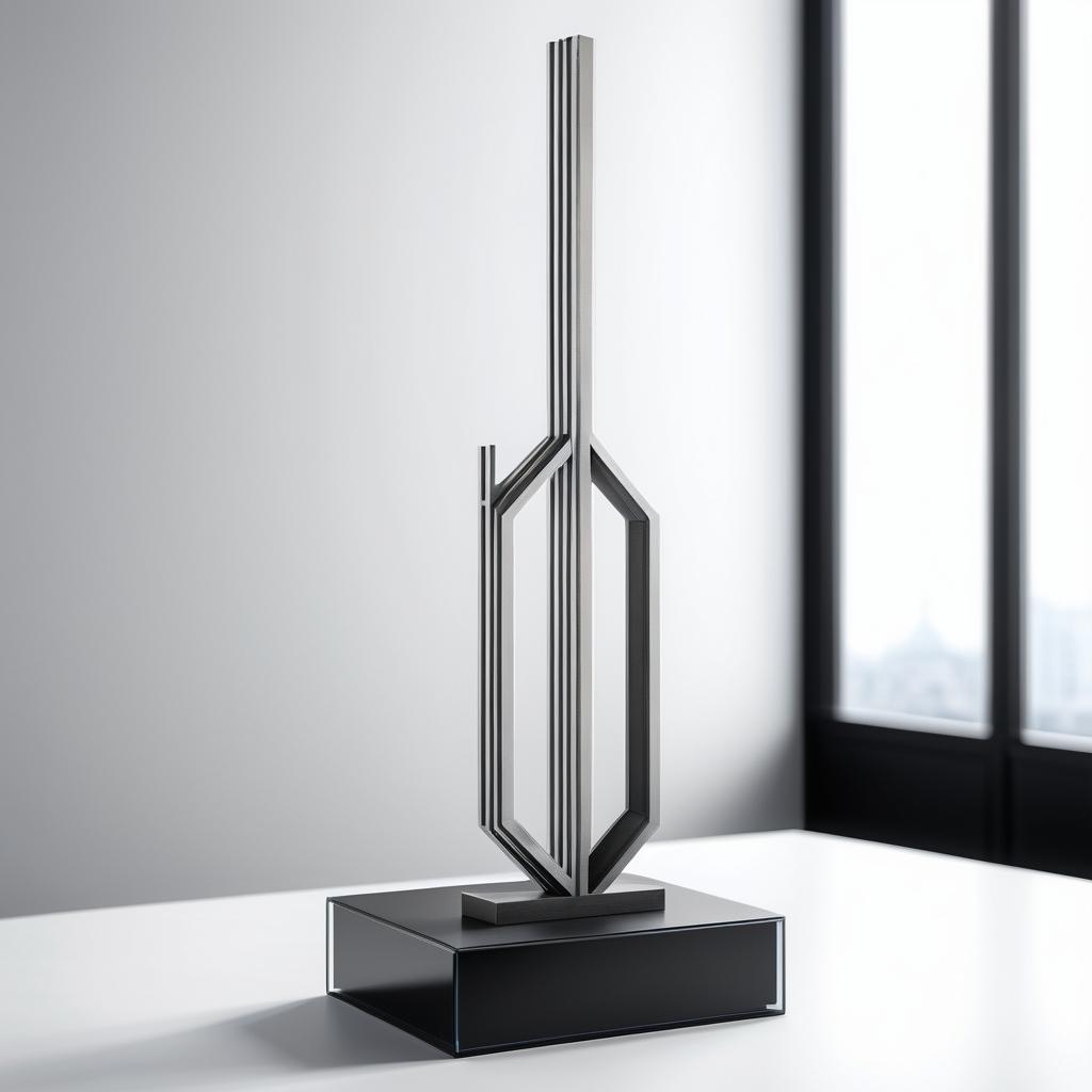 将这把剑的设计转化为雕塑时,可以利用其简洁线条来定义雕塑的整体结构。可以考虑使用金属材料,以增强作品的冷峻感和力道。剑身的直线造型可以通过拉长来强调其高耸感,而护手部分则可以设计得更加复杂,采用几何形状的镂空设计,以增加雕塑的视觉趣味性。整体风格应保持极简主义,强调形状的对称与平衡,使其在空间中拥有强烈的存在感。
