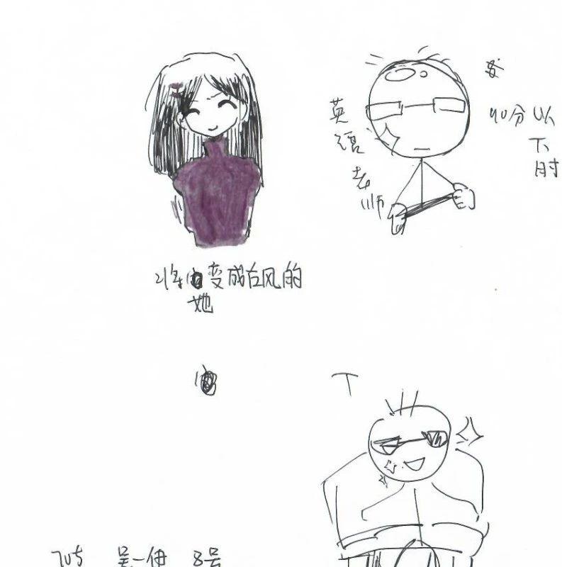 这幅手稿展示了三个人物形象,具有幽默和轻松的情感表达。左侧人物线条柔和,颜色简单,展现出一种温暖的氛围。中间和右侧的人物以简洁的线条和夸张的表情传达出轻松的氛围。整体构图简单但富有情感,形成了一种动态的平衡。