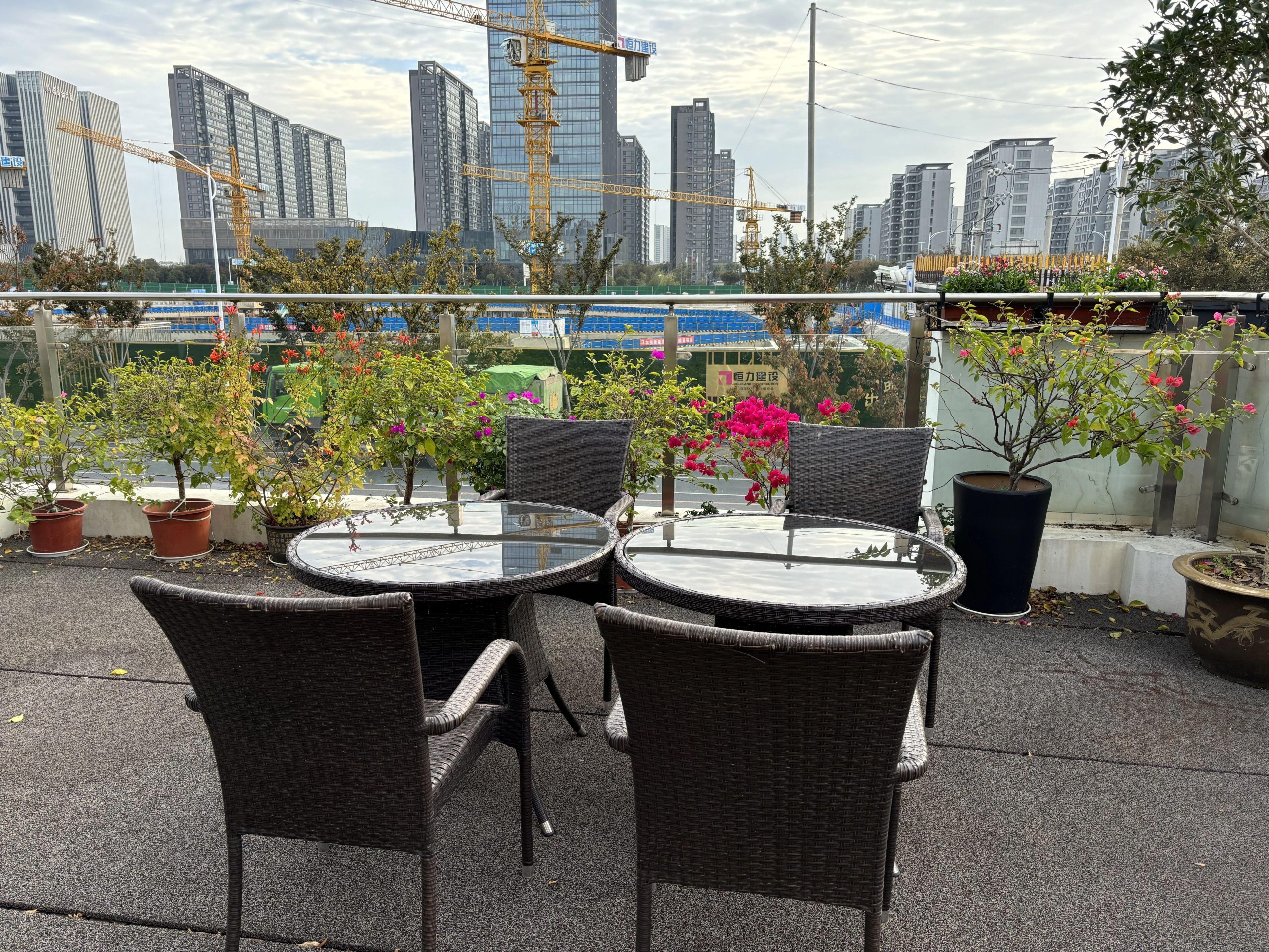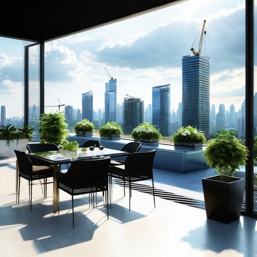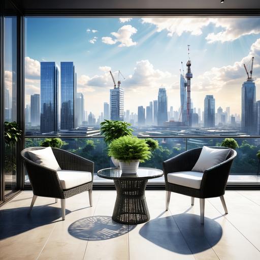 这幅作品展示了一处城市中的露台景观,前景是几张藤制的椅子和玻璃桌,背景则是现代的高楼建筑和正在施工的塔吊。植物的生机与背后的钢筋水泥形成对比,表现出自然与城市的融合。画面色调自然,阳光照射下的玻璃桌面反射出明亮的光影,增添了活力。