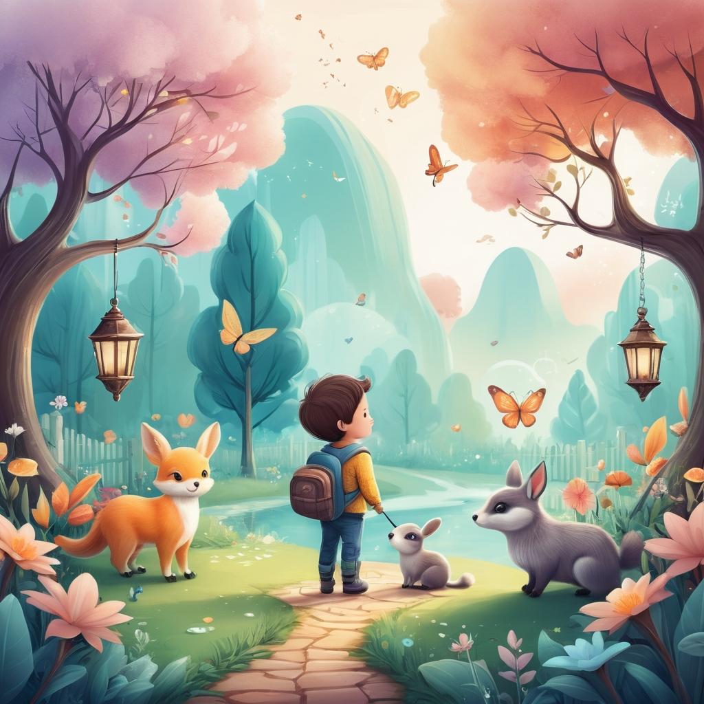 利用柔和的调色板和梦幻元素,如在角色的背景中加入自然景观,如温暖的阳光和微风吹拂的树叶。角色可以与环境互动,例如在花园中嬉戏或与小动物交流,增强插画的故事感和情感表达。