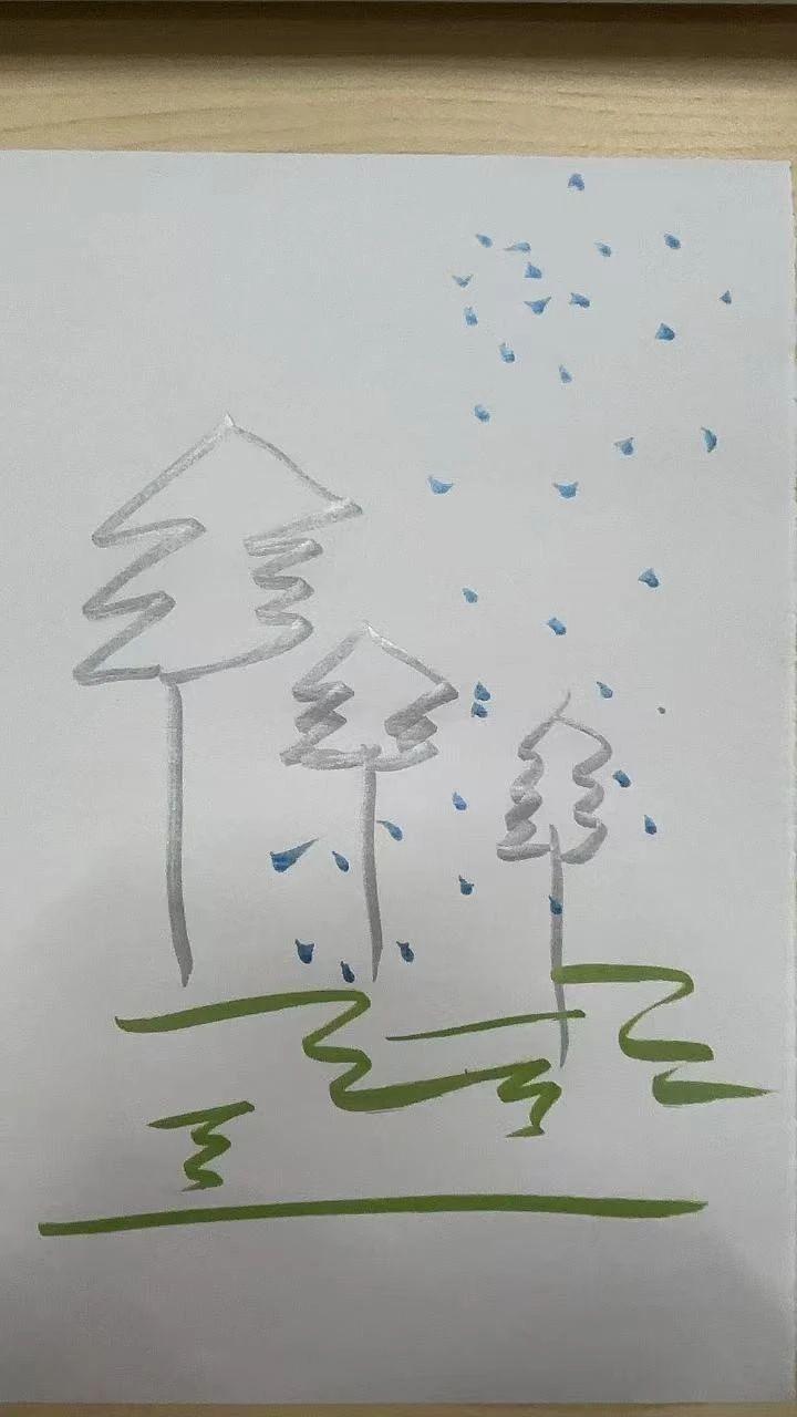 这幅插画展示了简单的树形轮廓和细小的蓝色点状元素,可能代表雨滴,整体风格简洁明快。树形的线条流畅自然,呈现出一种手绘感。场景富有童趣和梦幻色彩,能够激发观者的想象力。