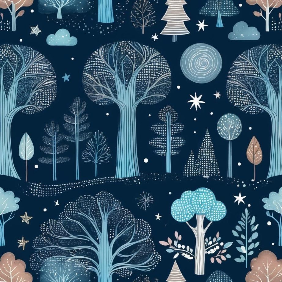 将这幅插画中的树形抽象化为魔法森林的一部分,蓝色点状元素可以扩展为闪烁的星光或漂浮的花瓣。通过添加幻想生物,如小精灵或友好的动物,增强画面的互动性和故事性。