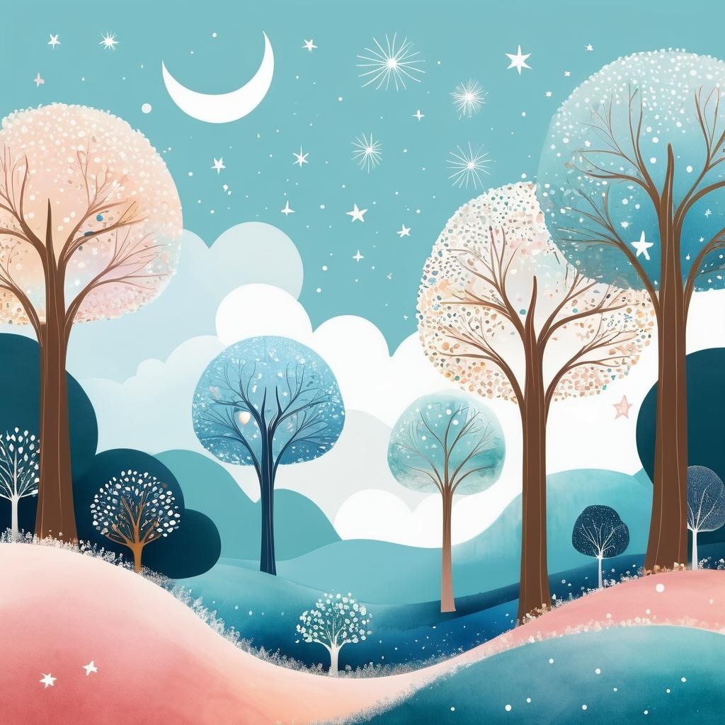 这幅插画通过简洁的树形线条和蓝色点状元素,创造出一个富有童趣和想象力的场景。尽管元素简单,但通过艺术创作的延展,可以将其转化为一个充满故事的幻想世界。通过分析原图中的线条和色彩,设计师可以将其转化为一个魔法森林,添加幻想生物和互动元素,增强画面的情感和故事性。运用柔和的色调和手绘的质感,使作品更具艺术性和吸引力。