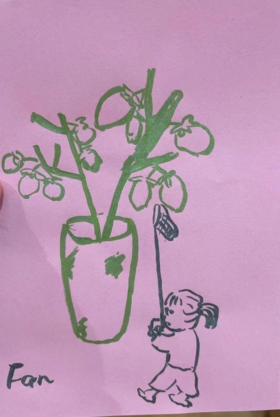 这幅插画展现了一个小女孩拿着网兜的场景,与大株的植物形成对比。人物特征包括简单的线条勾勒出的面部表情与动作姿态,表现出童趣的探索感。色彩上,紫色背景与绿色线条形成鲜明对比,线条流畅且手绘感明显。场景具有超现实的趣味性,仿佛女孩在与巨大的植物进行互动。