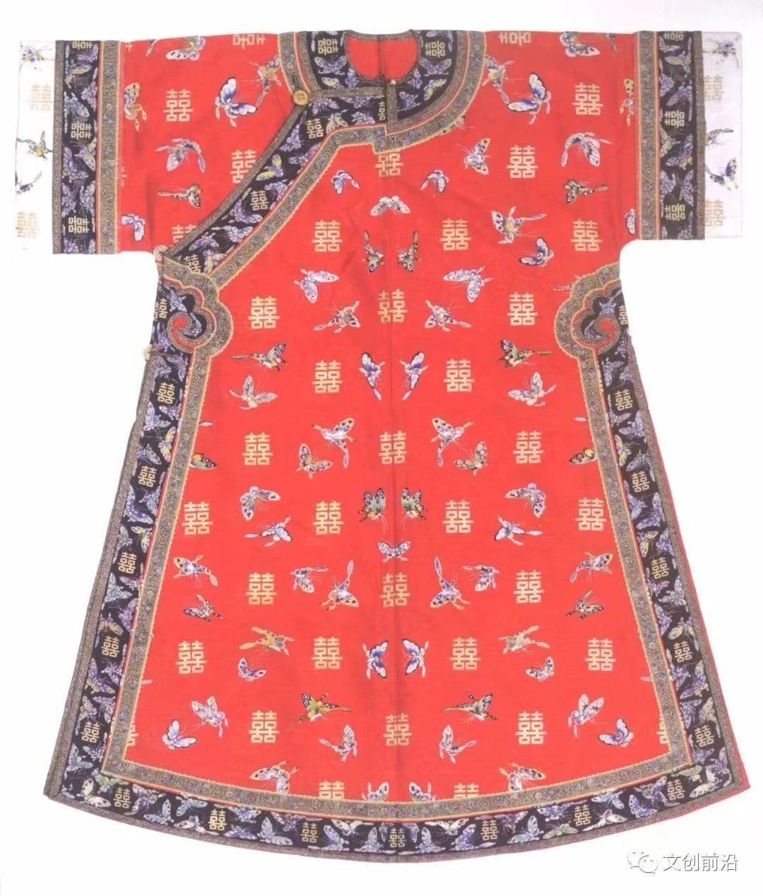 这幅图像展示了一件传统服饰,色彩鲜艳,图案复杂。红色底色象征着喜庆与活力,繁复的蝴蝶和’囍’字图案寓意祝福与美好。服饰的剪裁简洁,但在细节上展现出丰富的文化内涵,尤其是边缘的黑色镶边,增强了整体的层次感和视觉对比。