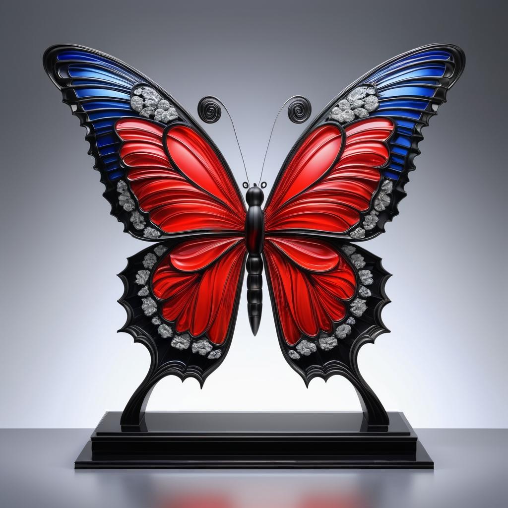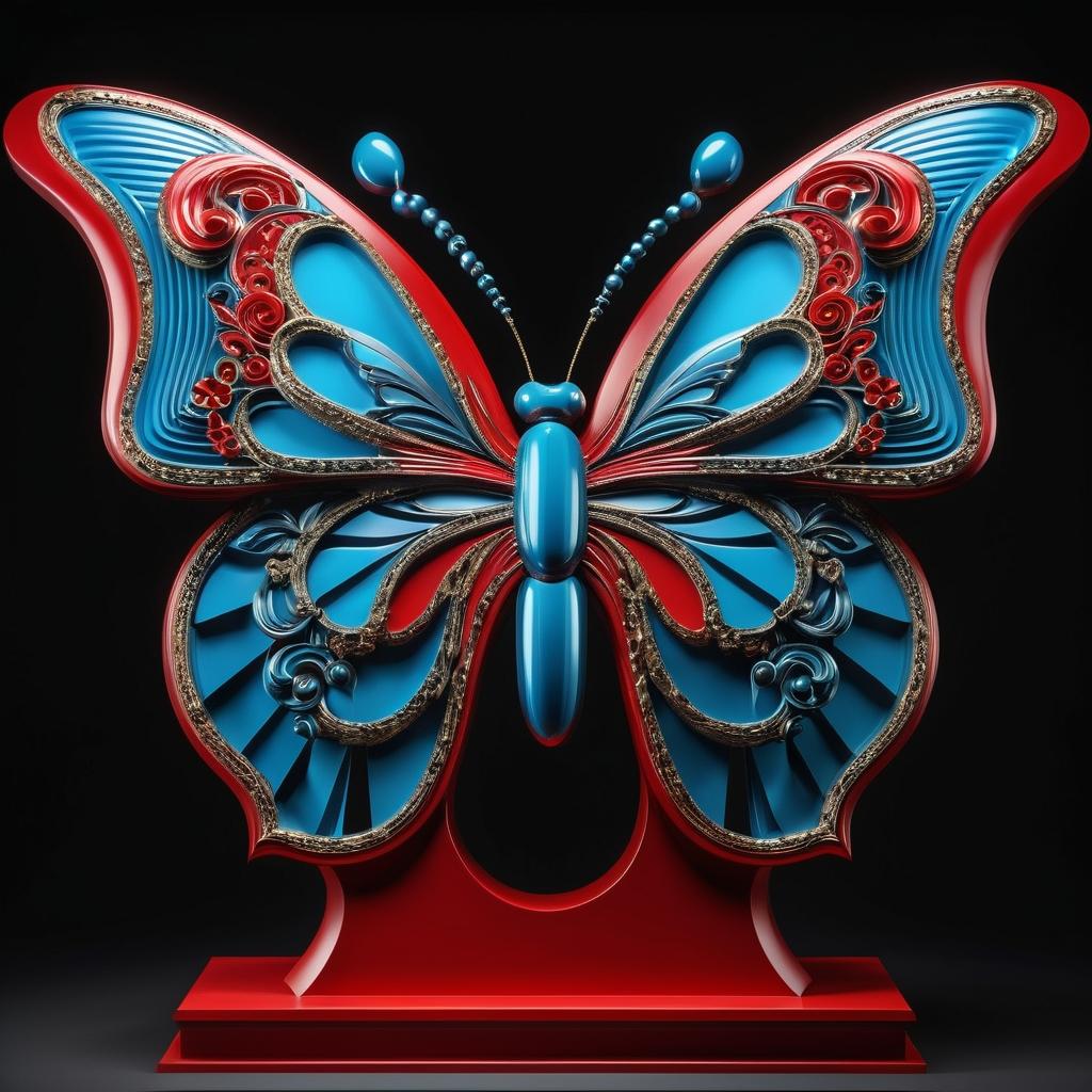 这件服饰的设计可以转化为一件雕塑作品,强调其象征意义和视觉元素。可以在雕塑中使用鲜明的色块与复杂的纹理来表现服饰上的图案,并通过流动的线条捕捉蝴蝶的动感。使用金属或玻璃材质来表现红色的鲜艳与图案的细腻,确保雕塑在不同光线下展现出丰富的层次和色彩变化。